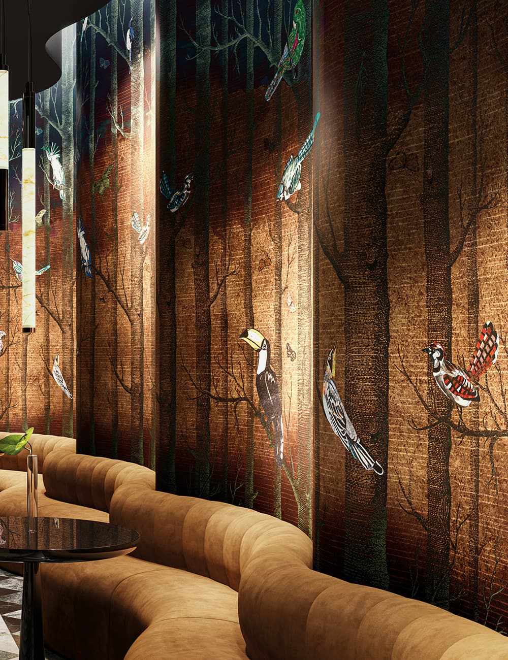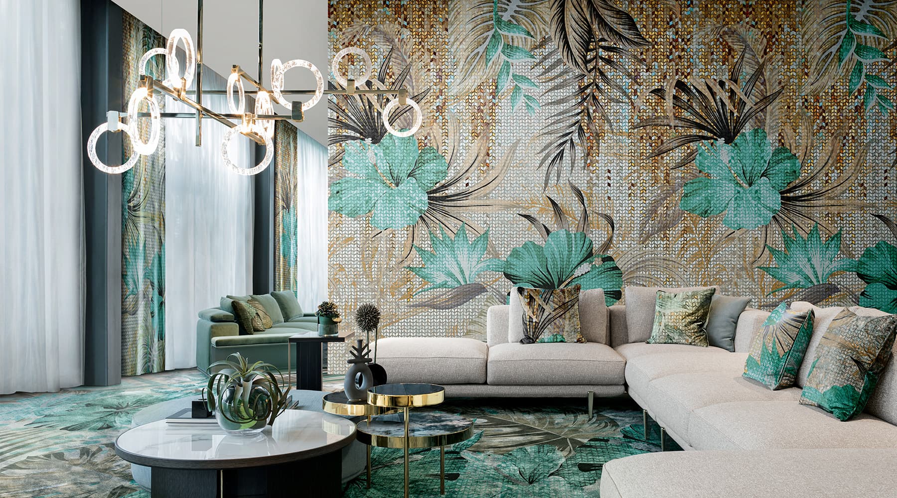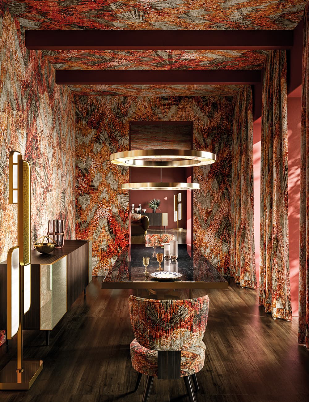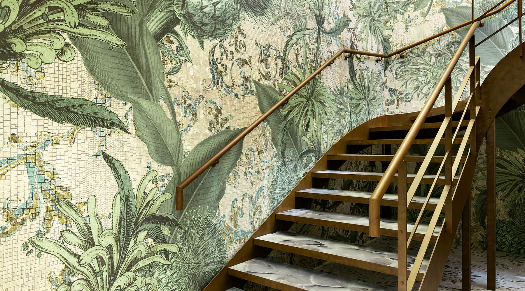 Wallpaper, tessuti, tappeti e Vetrite possono essere coordinati per creare un racconto coerente, su misura, perfettamente integrato con lo spazio e l’identità del cliente.