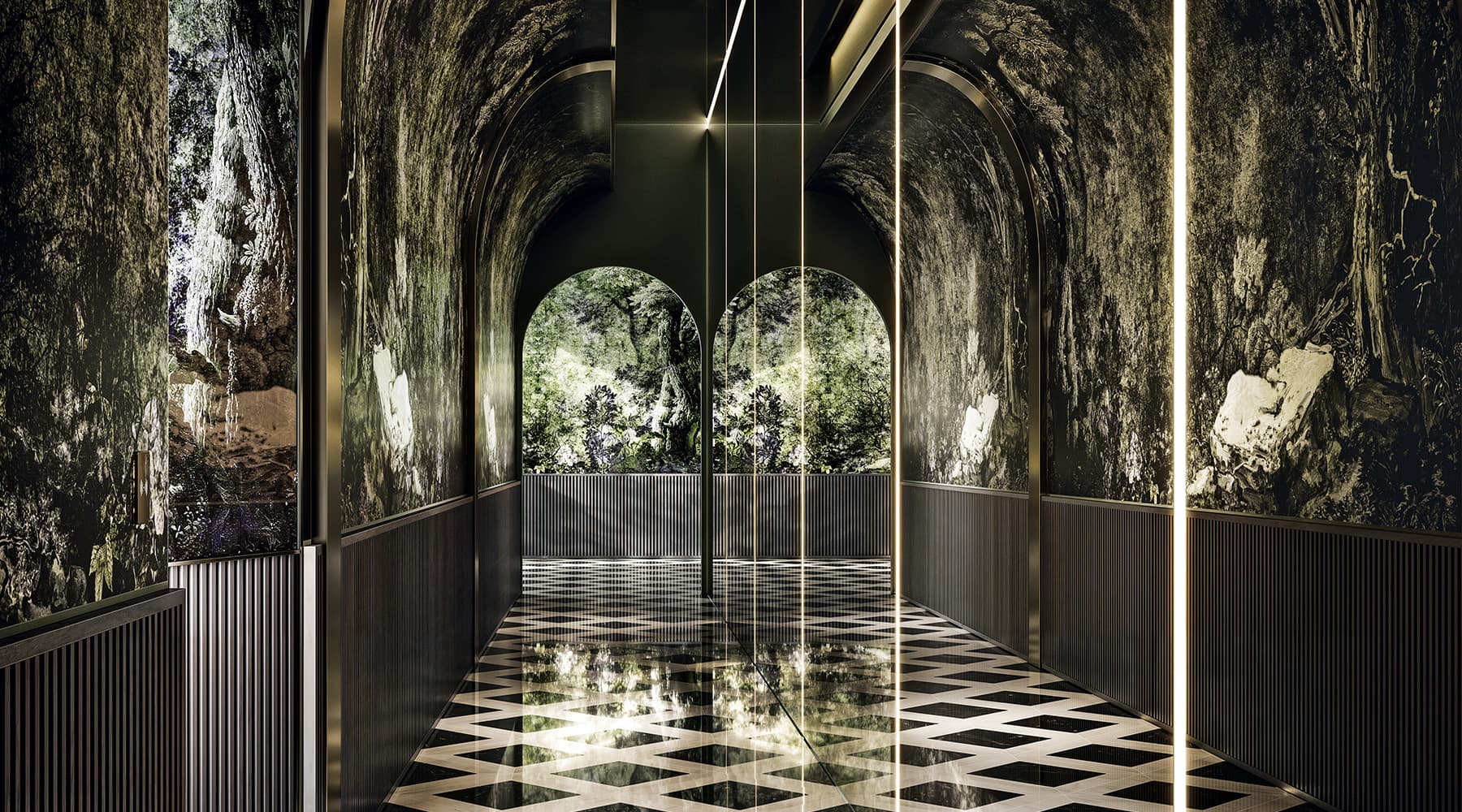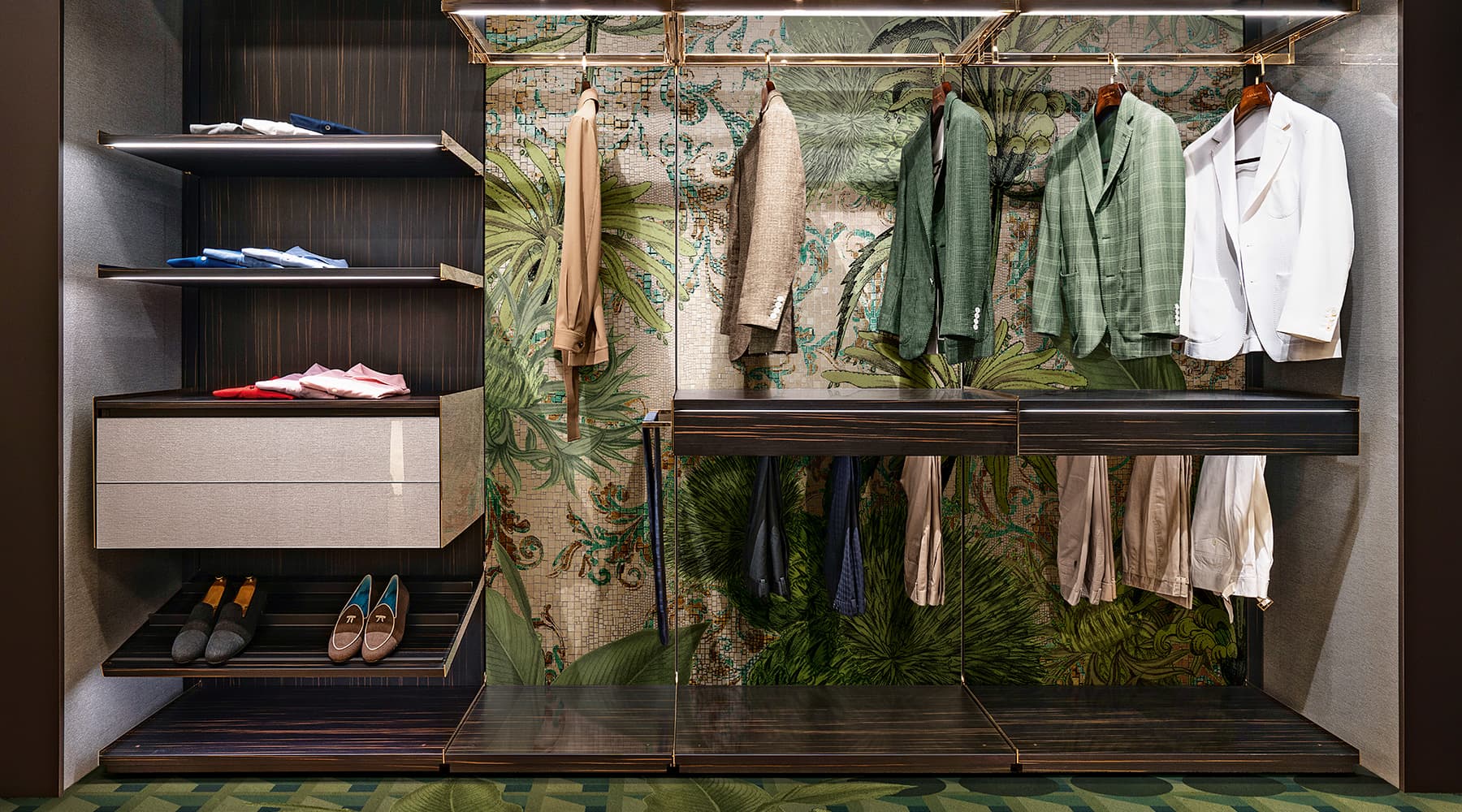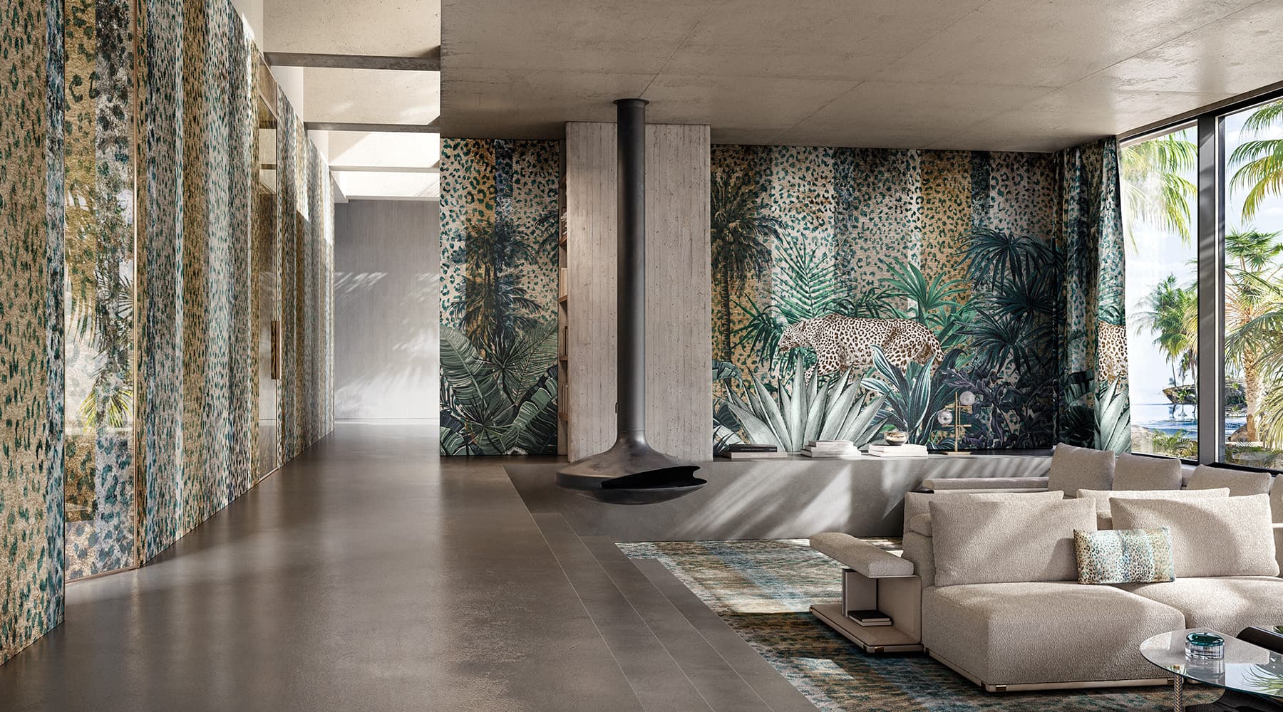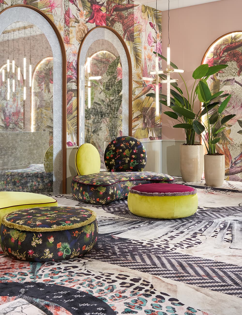 Wallpaper, tessuti, tappeti e Vetrite possono essere coordinati per creare un racconto coerente, su misura, perfettamente integrato con lo spazio e l’identità del cliente.