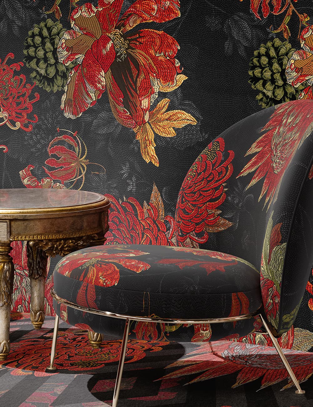 In Faux Mosaique®, ogni superficie diventa racconto. I motivi iconici dell’arte musiva si trasformano in trame grafiche che vestono pareti, tessuti e arredi con un’estetica intensa e distintiva.