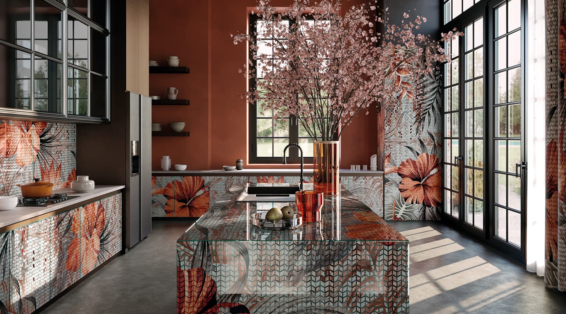 Le grafiche Faux Mosaique® si fondono alla materia iconica di SICIS: la Vetrite. All’interno delle lastre in vetro stratificato, l’interlayer decorativo crea superfici preziose e versatili.