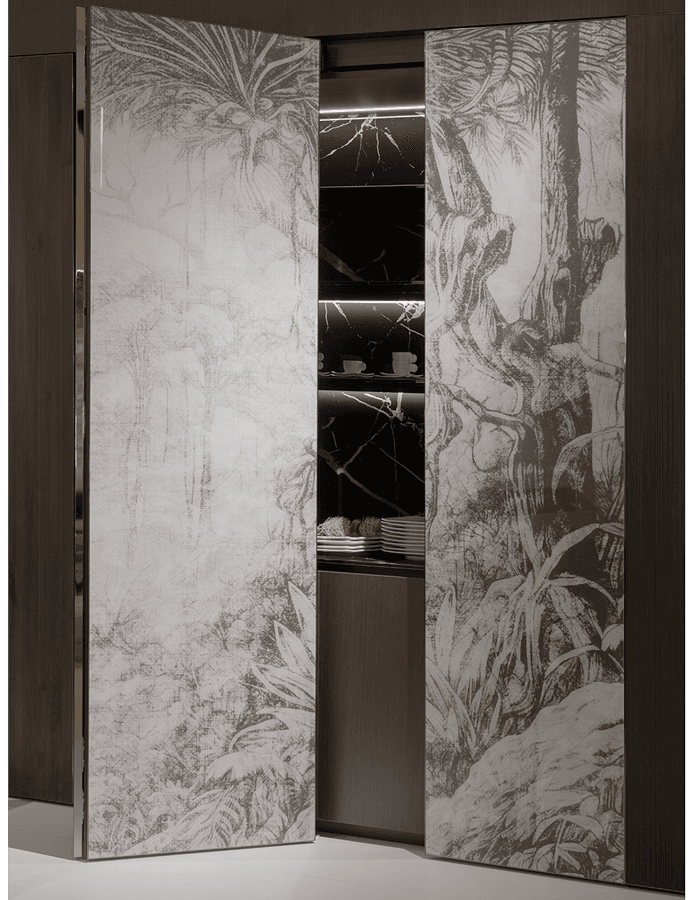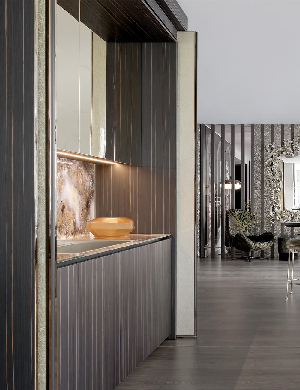 Le vetrine e le nicchie diventano scenografie da abitare. Gli inserti in metallo nikel nero e scocche nere di San Marco sottolineano l’identità materica e la cura sartoriale del progetto, mentre le ante in Vetrite con rete trasparente di Rialto valorizzano gli oggetti esposti. Ogni scelta celebra l’unicità del dettaglio e la straordinaria bellezza della composizione.