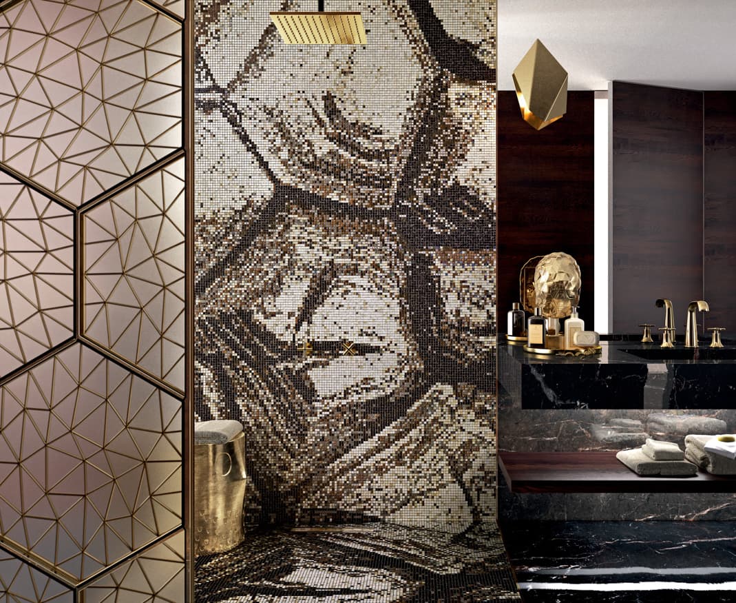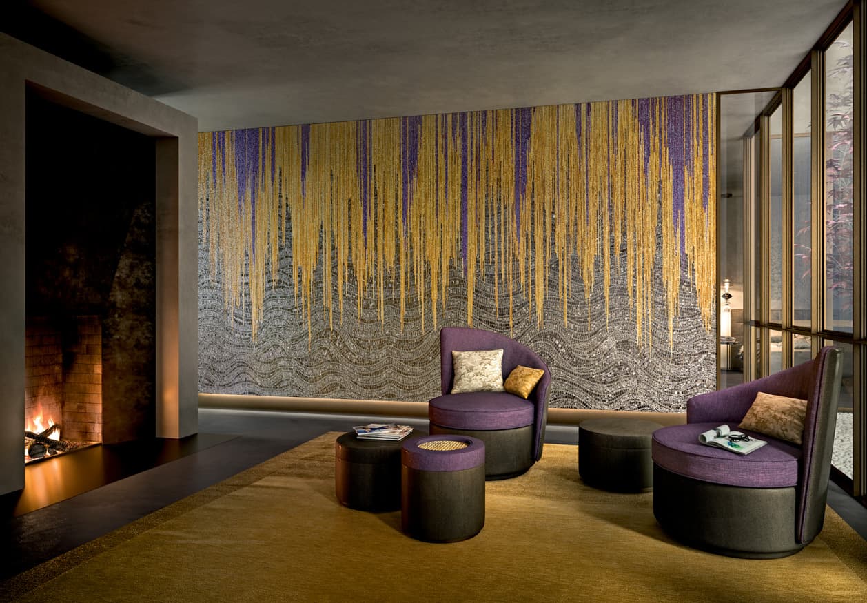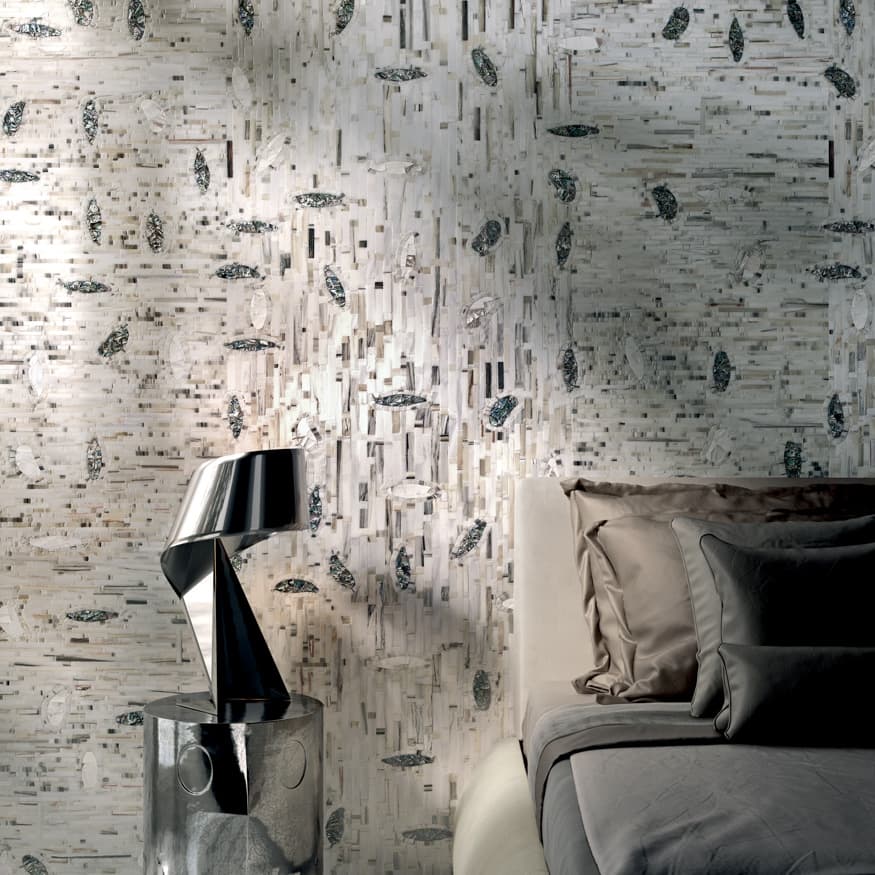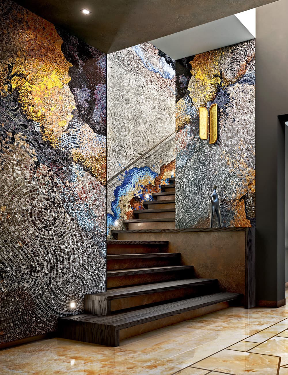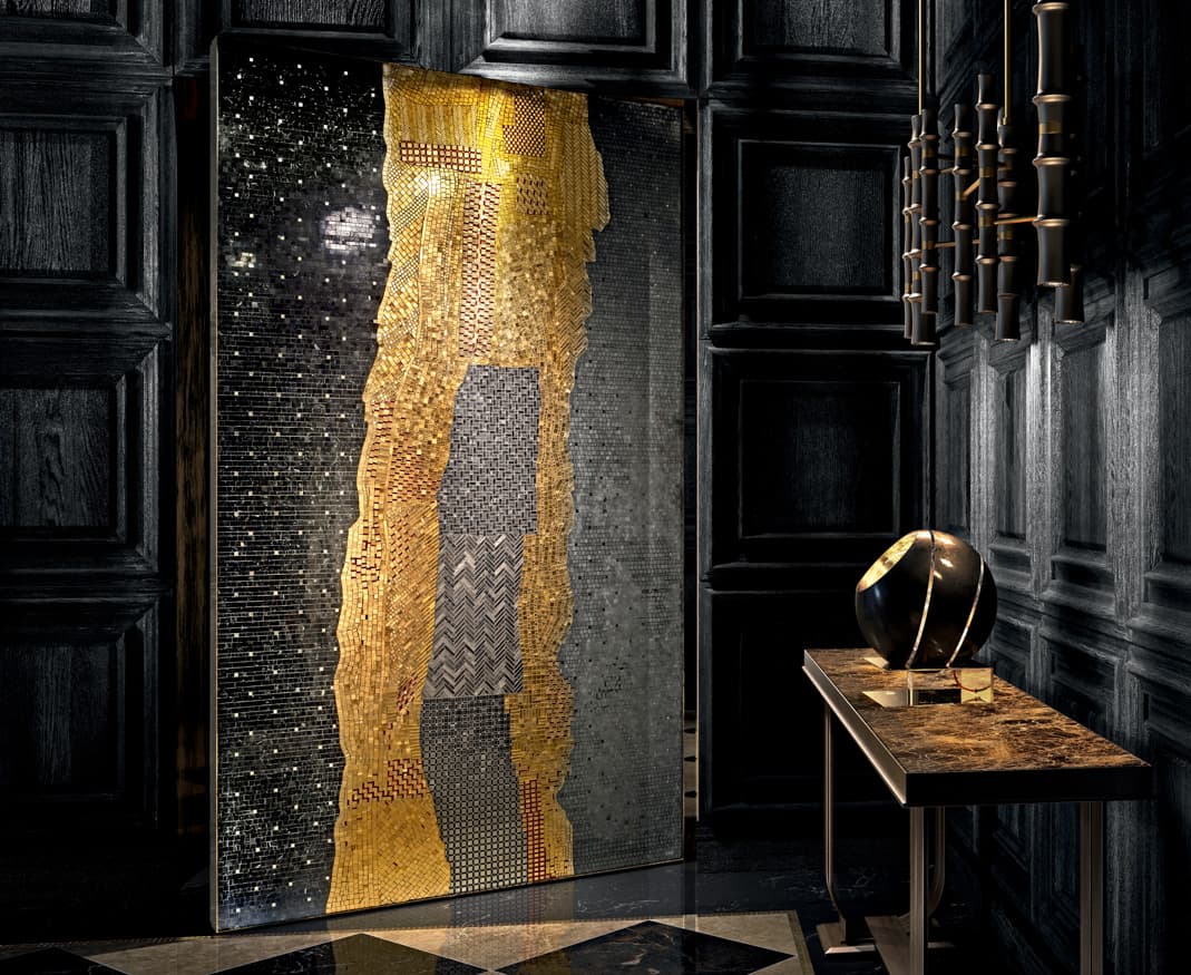 Pareti che diventano opere d’arte, crescono, si ampliano e arricchiscono lo spazio, come scenografie di un teatro. Il movimento prende vita dai materiali che si sovrappongono e creano forma e profondità con uno stile unico. La magia sensoriale e la poetica tridimensionale decorano l’ambiente, rendendolo un luogo sospeso nel tempo. Opere di stile e maestria, per riscopre le infinite possibilità espressive del mosaico artistico.