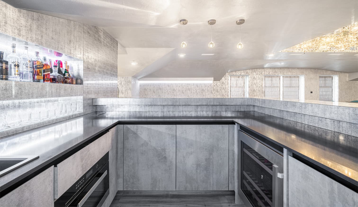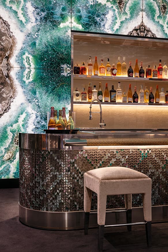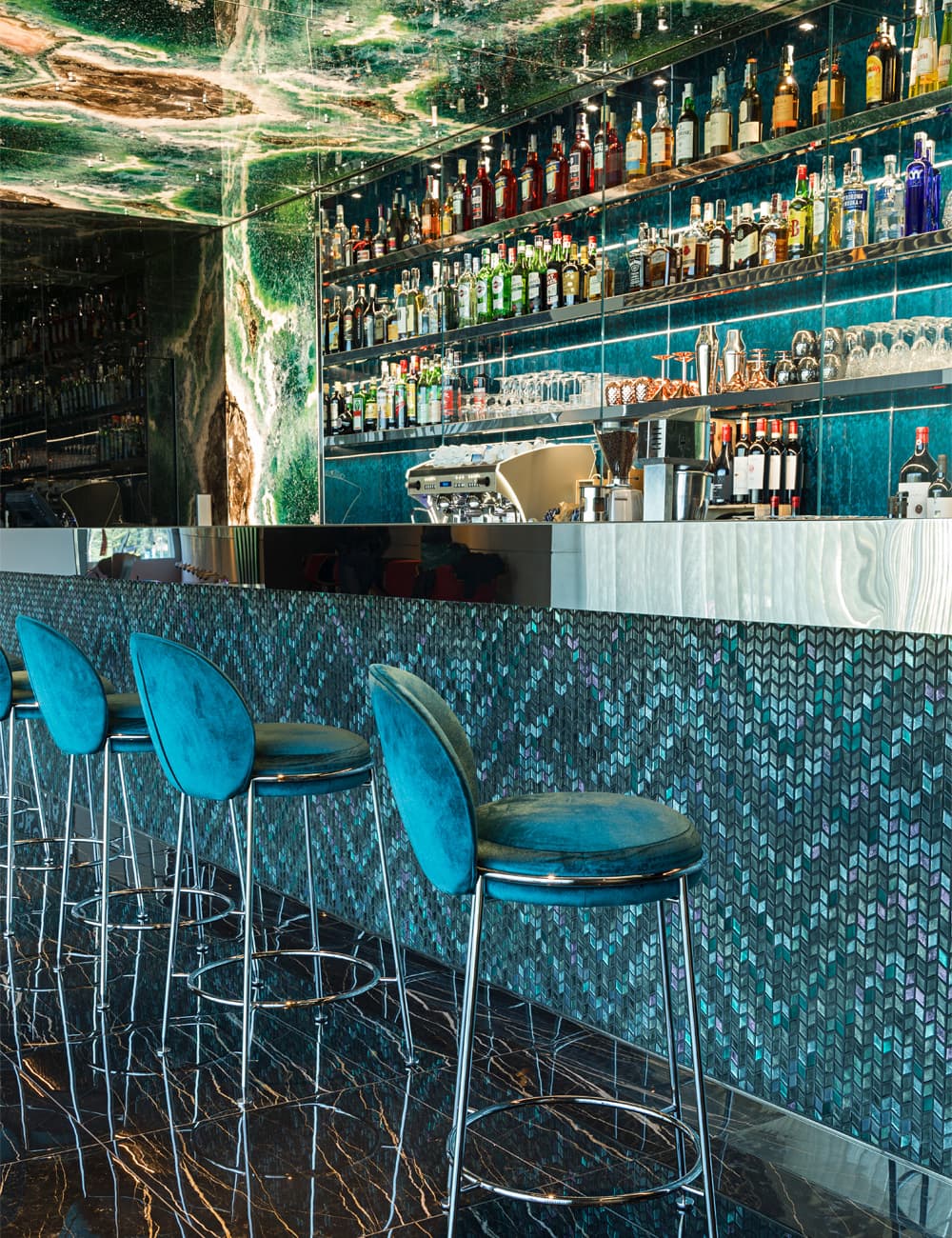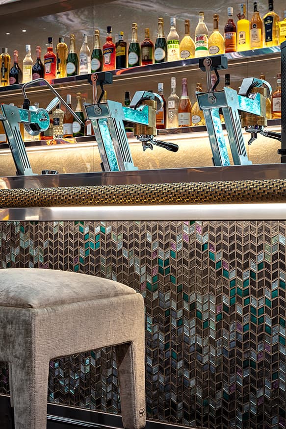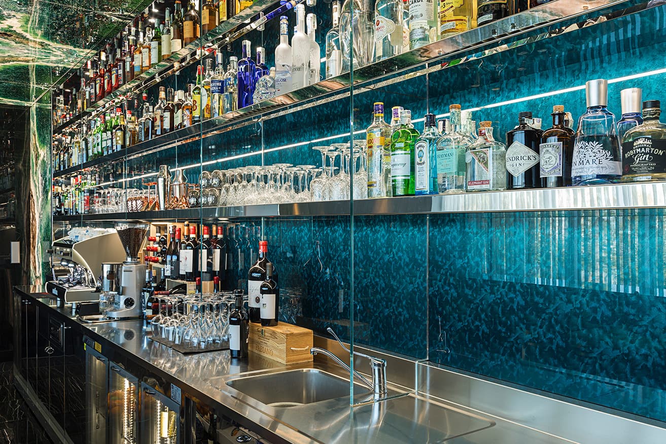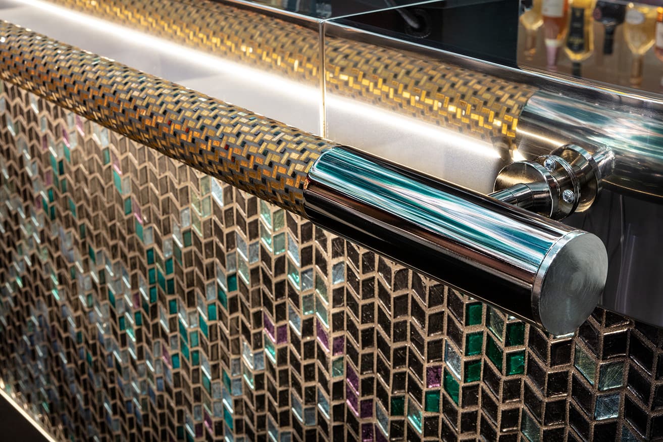 Le soluzioni proposte realizzabili su misura, in base alle necessità sono modulabili, sia per quanto riguarda gli accessori del banco bar, che nei rivestimenti, in mosaico o Vetrite.