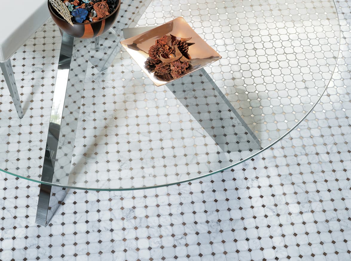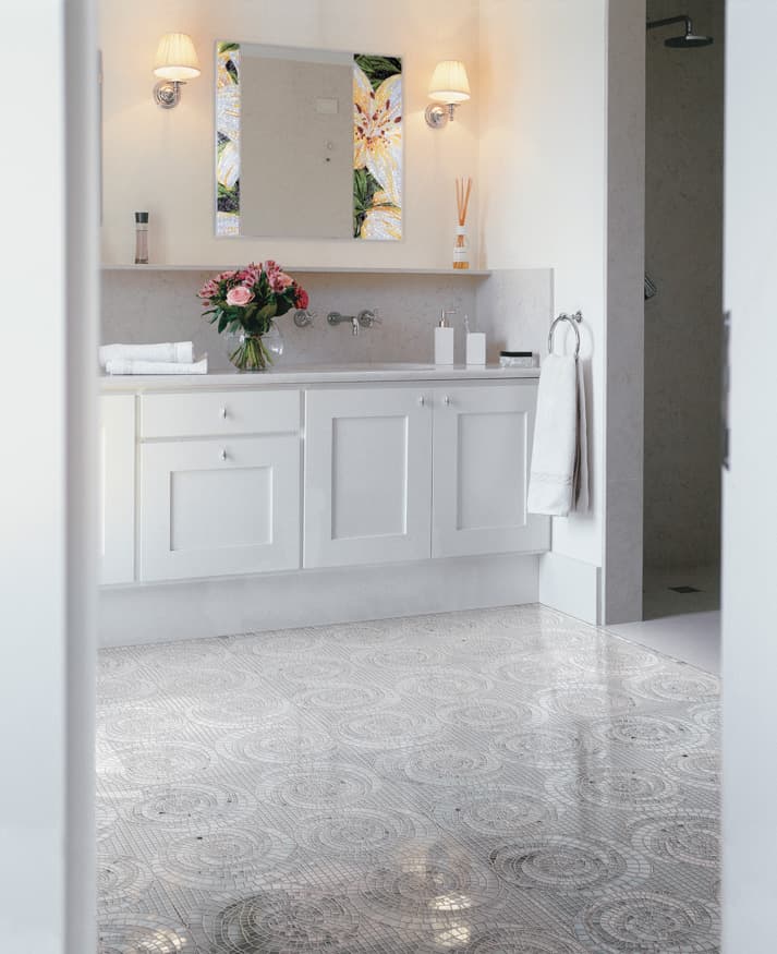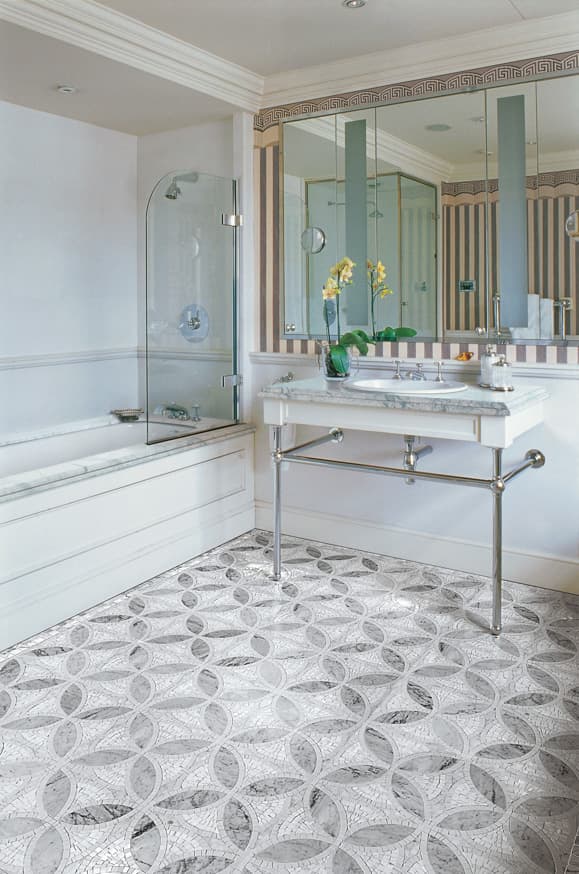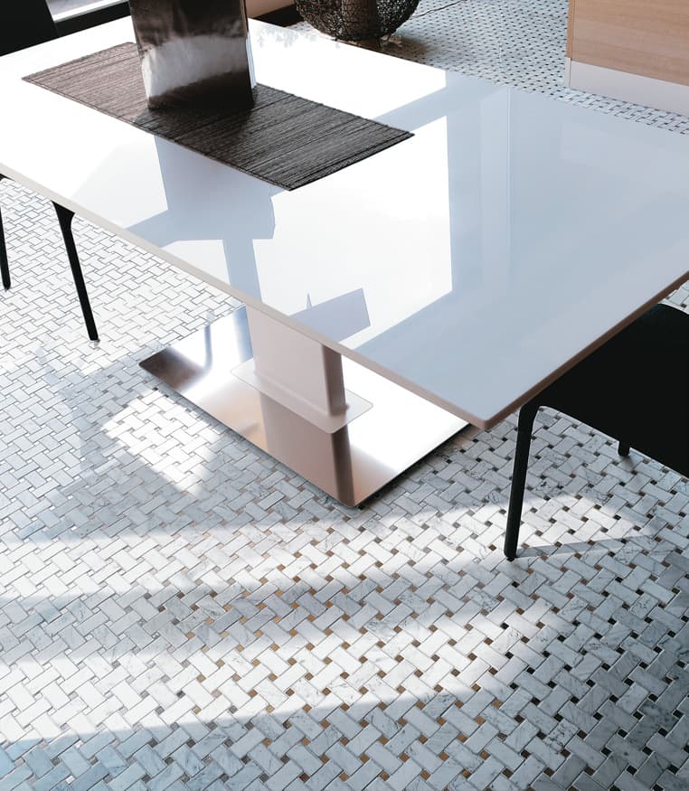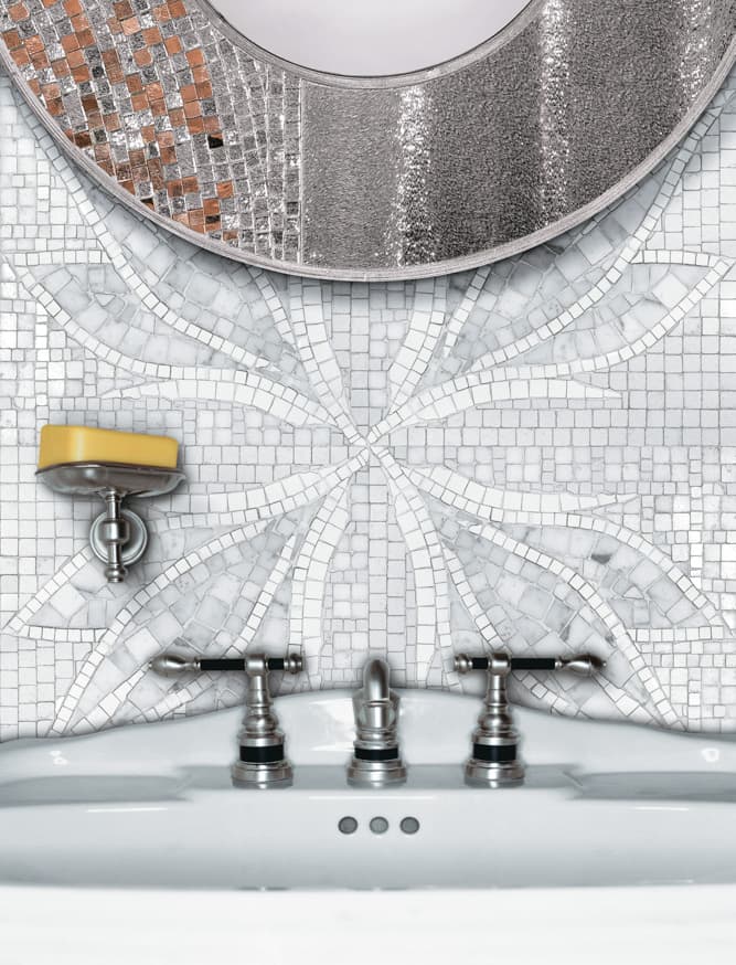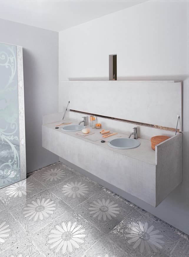La luce attraverso le linee sinuose di un disegno dalle geometrie perfette. Uno stile sartoriale, esclusivo; forme modulari in composizioni di impeccabile equilibrio, mosaici in marmo, insieme a tessere di mosaico oro, platino, vetro Murano. Indiscutibile eleganza.