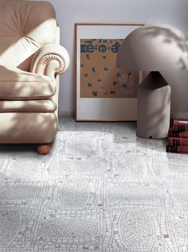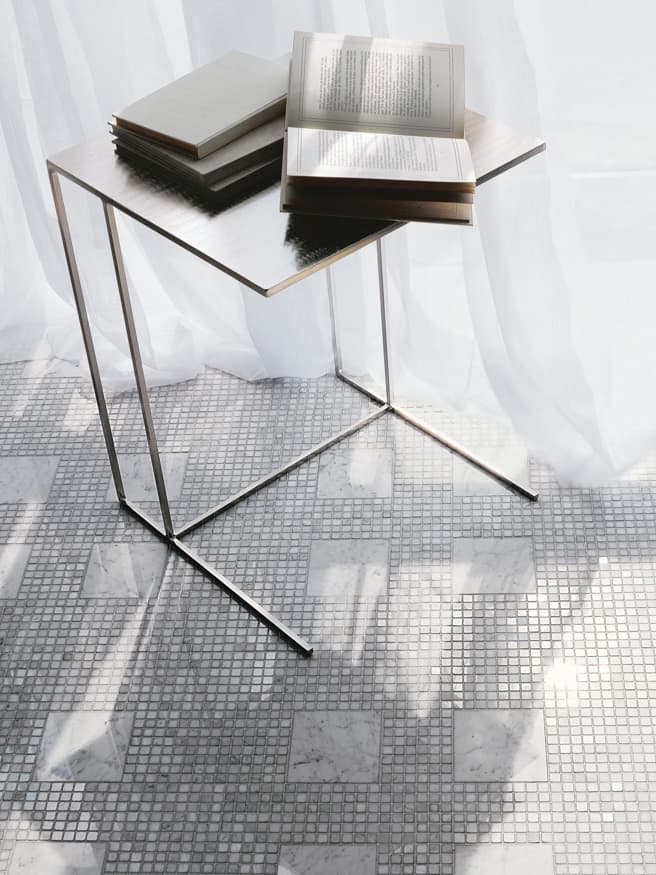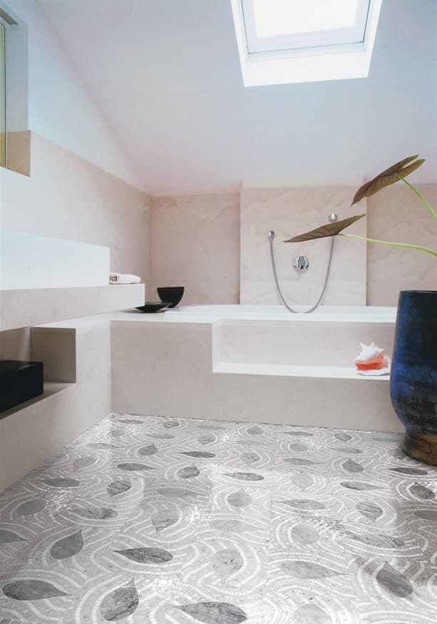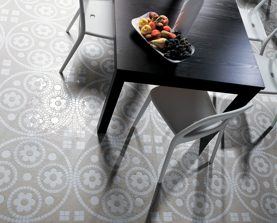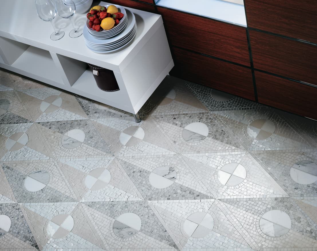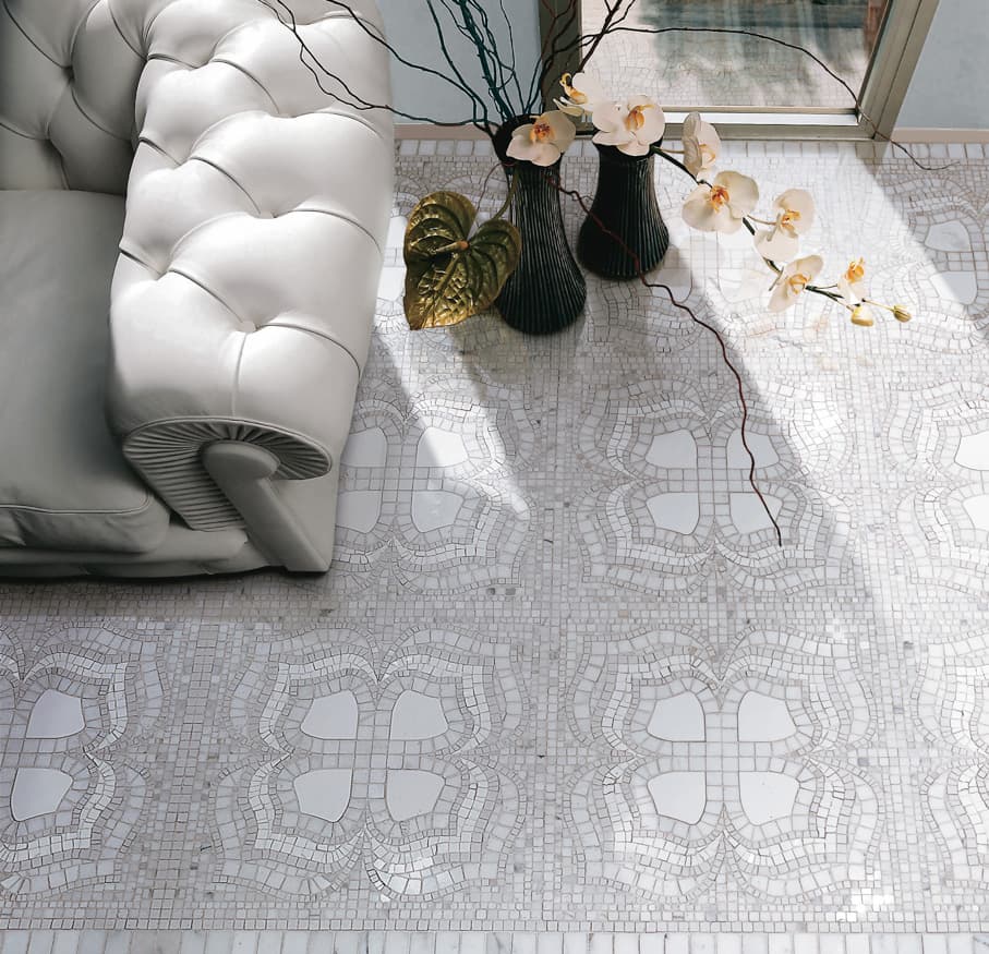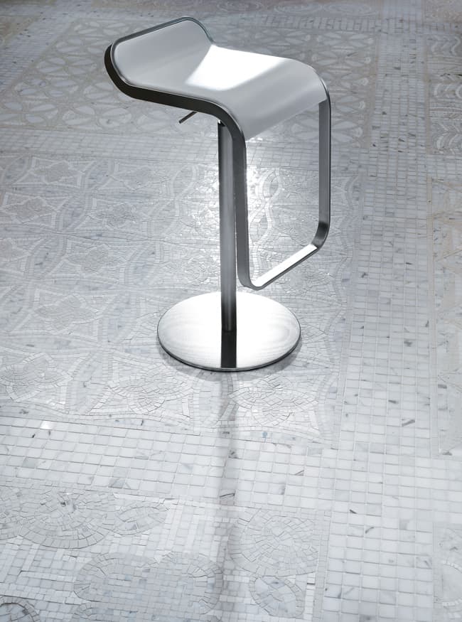 Il marmo e la pietra. Sono le materie pure ad essere protagoniste di queste superfici, materiali che nei secoli hanno abbellito pavimenti di chiese e dimore importanti, su cui abbiamo camminato e che abbiamo ammirato per la loro luce ed eleganza. Ora questi materiali pregiati sono proposti in armoniosi giochi geometrici e uniti a speciali tessere di mosaico in oro, platino e vetro Murano. Solidità e leggerezza, chiari e scuri, raffinati contrasti per superfici uniche.