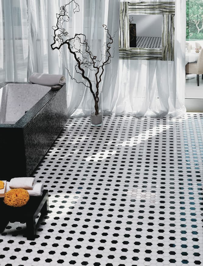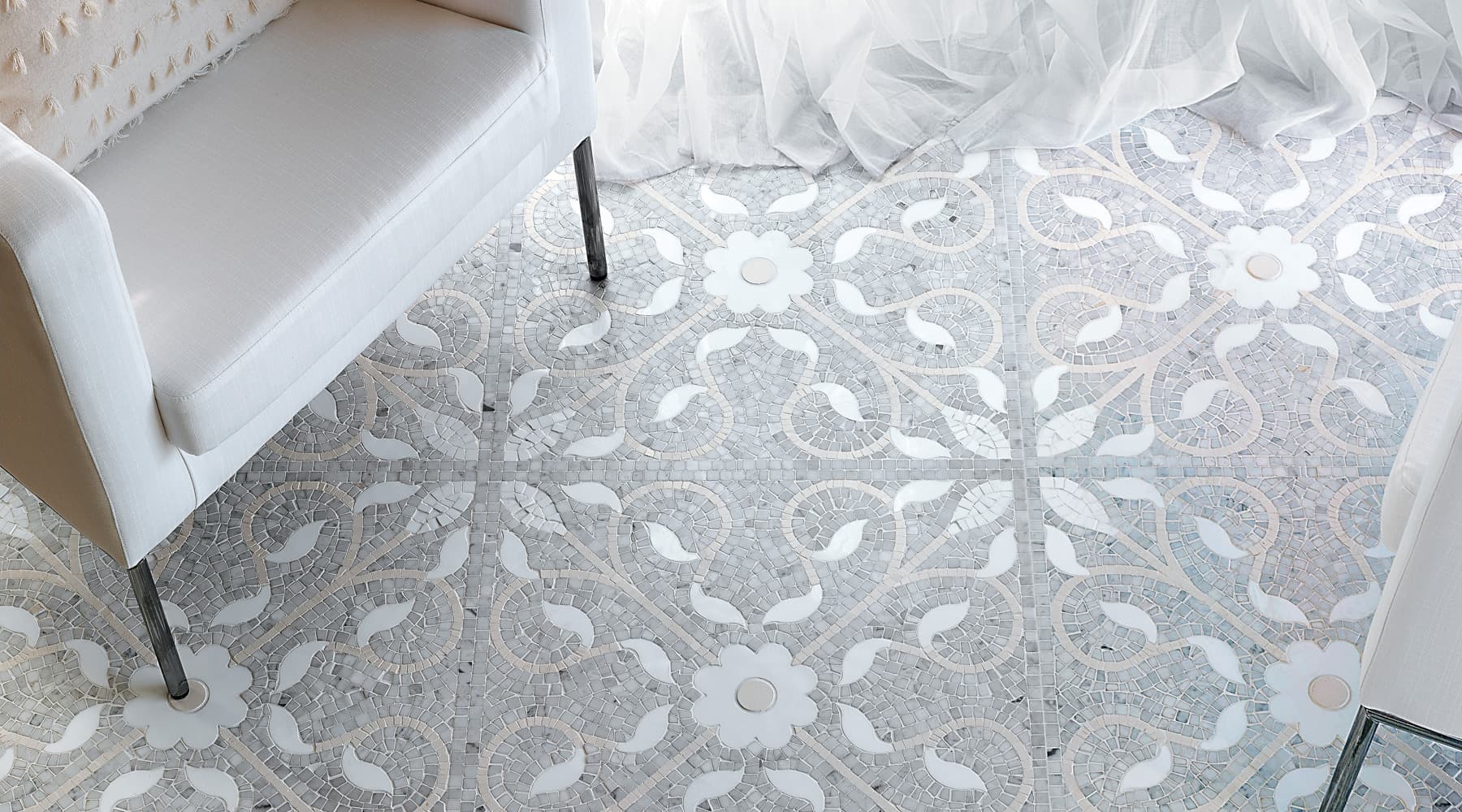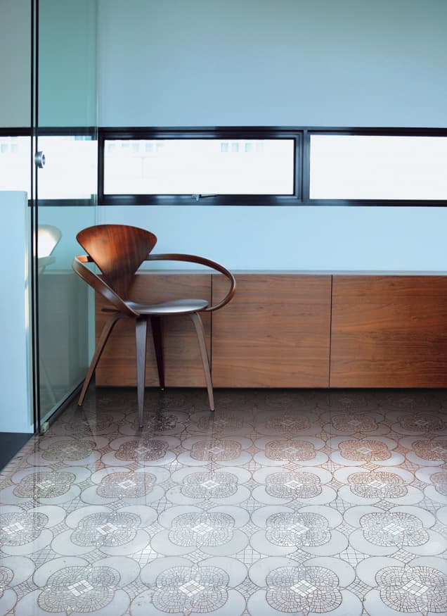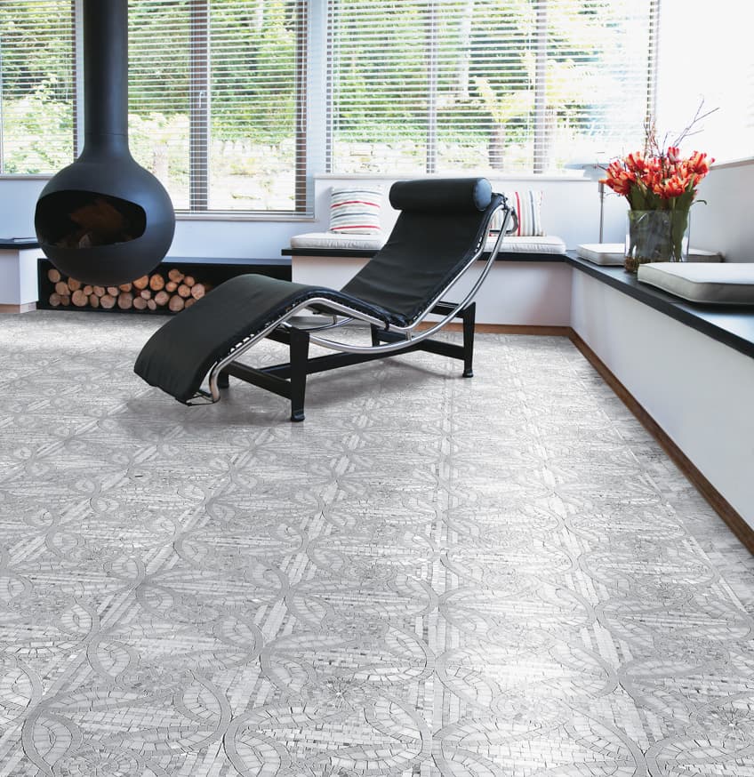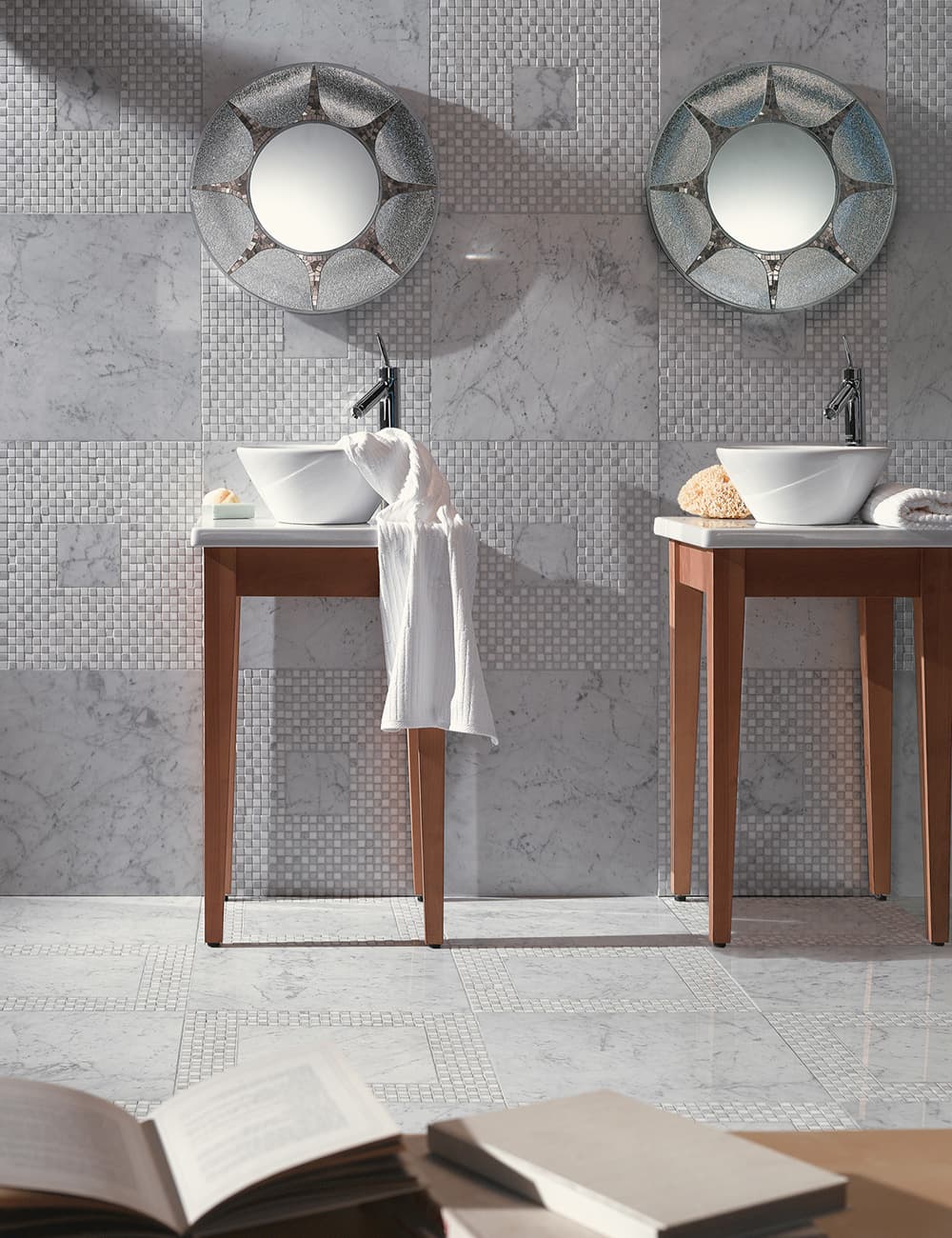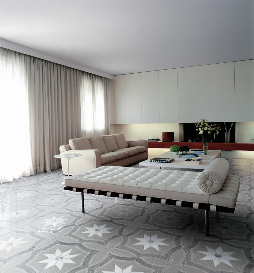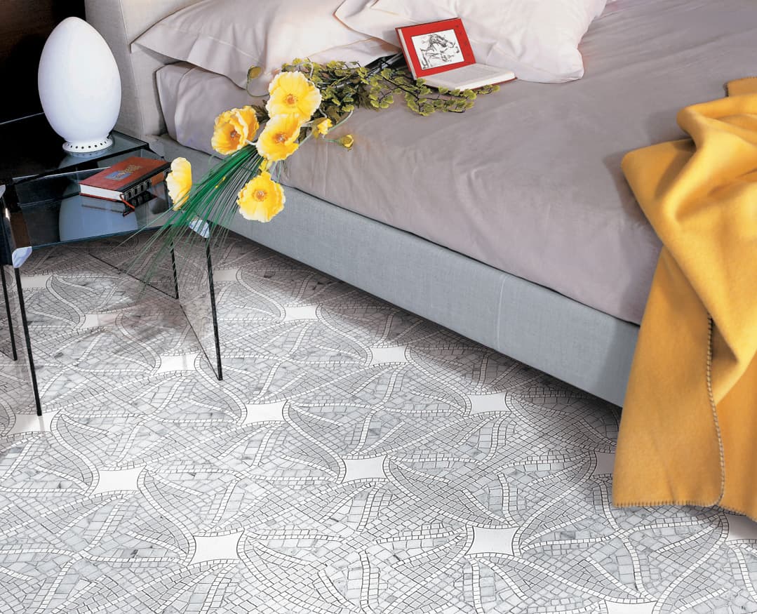 Il marmo e la pietra. Sono le materie pure ad essere protagoniste di queste superfici, materiali che nei secoli hanno abbellito pavimenti di chiese e dimore importanti, su cui abbiamo camminato e che abbiamo ammirato per la loro luce ed eleganza. Ora questi materiali pregiati sono proposti in armoniosi giochi geometrici e uniti a speciali tessere di mosaico in oro, platino e vetro Murano. Solidità e leggerezza, chiari e scuri, raffinati contrasti per superfici uniche.