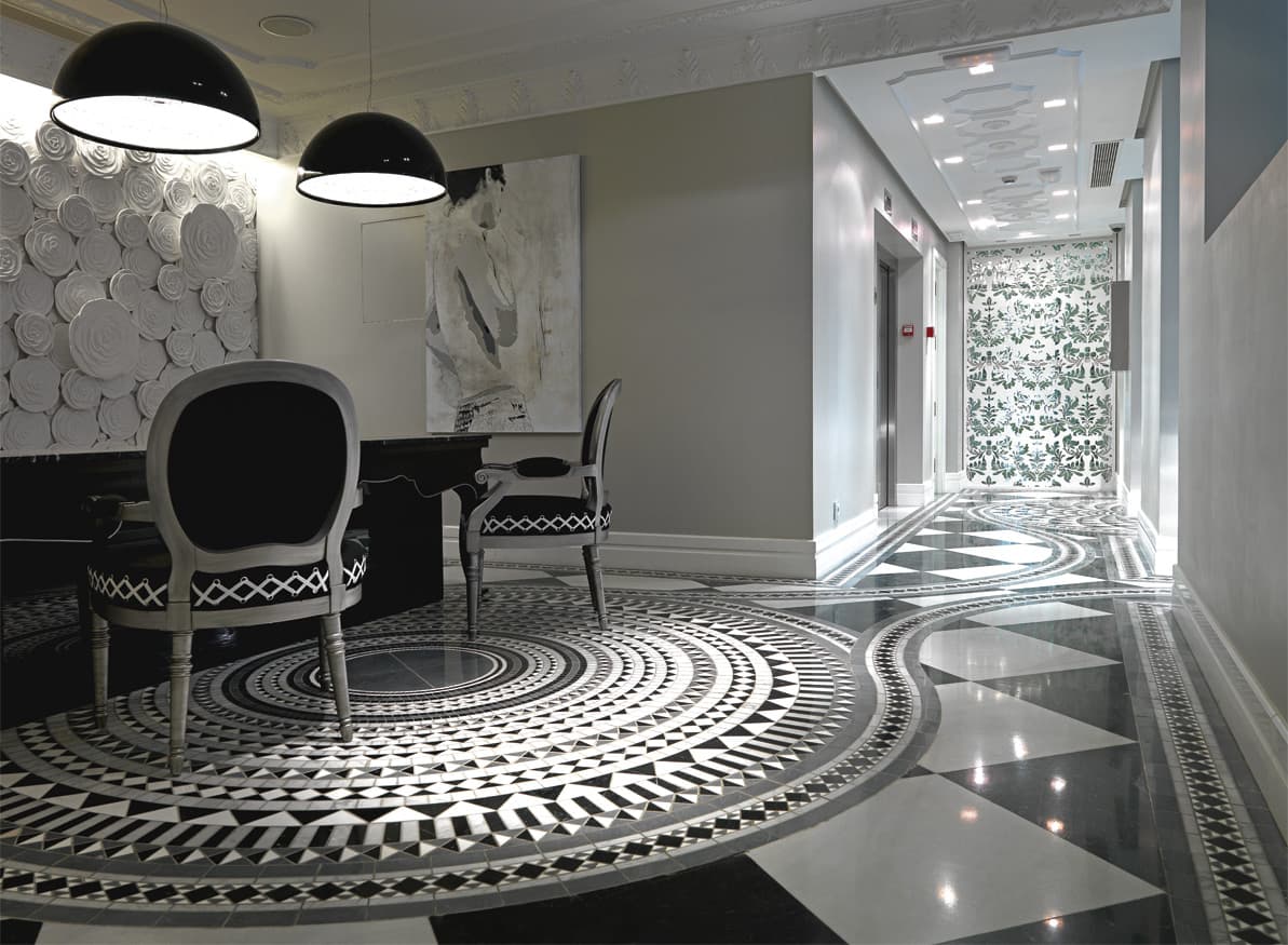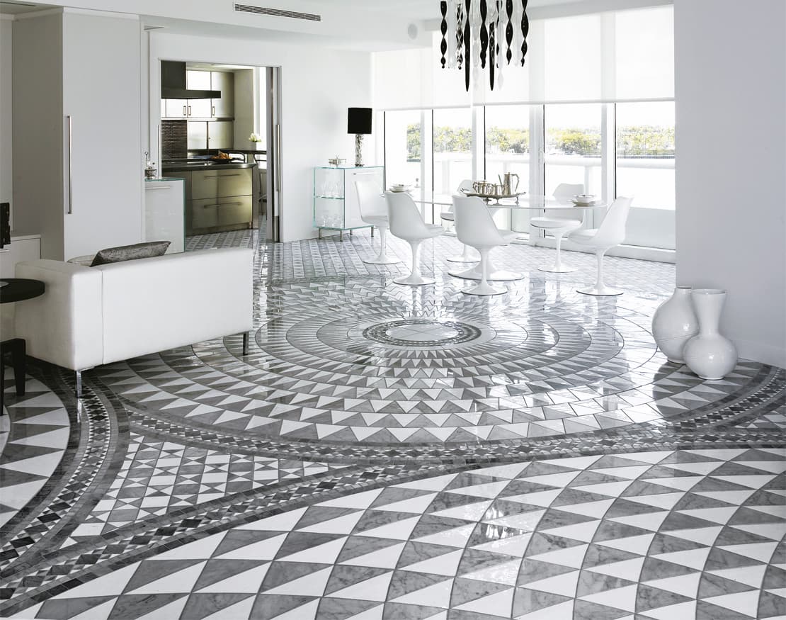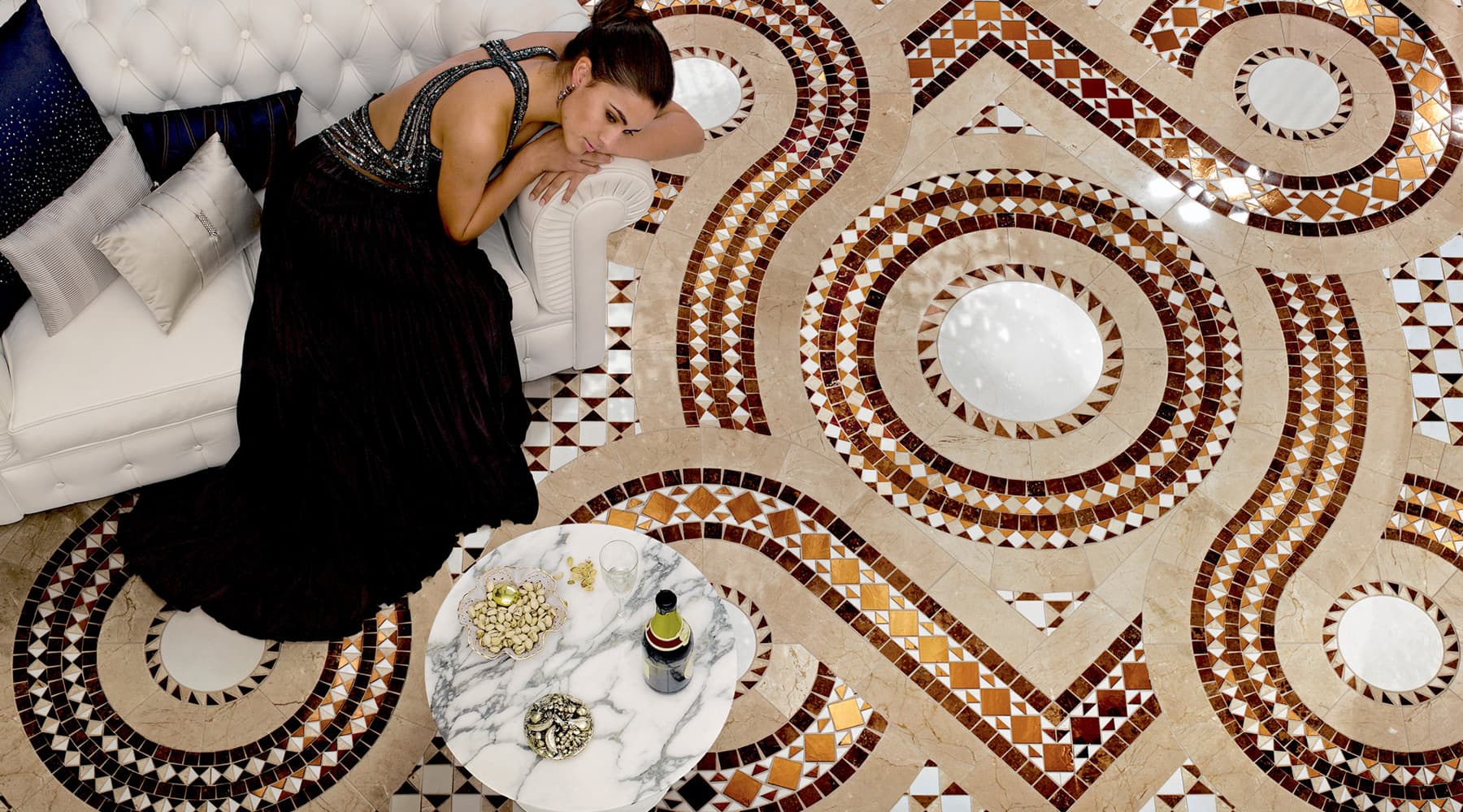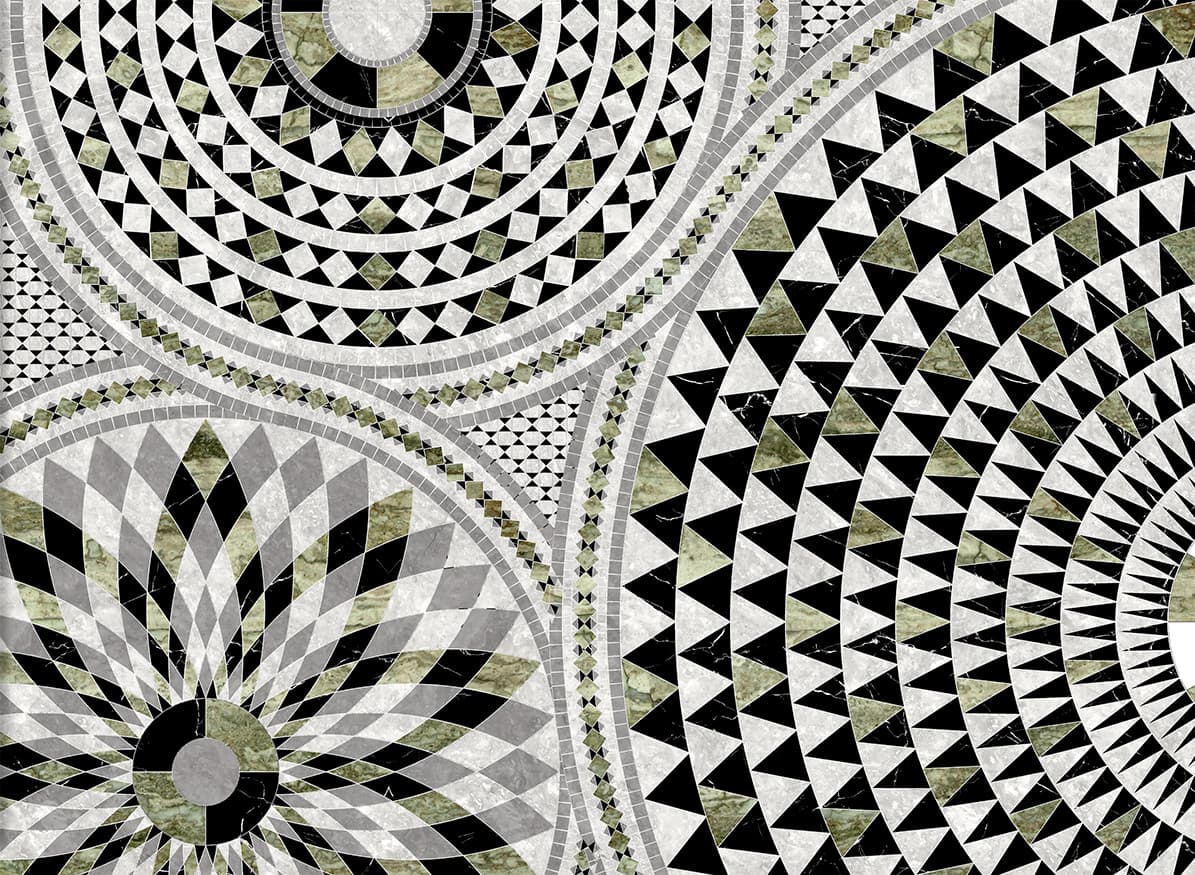 Rotazioni e simmetrie, secondo un ordine perfettamente matematico. Uno studio approfondito del mosaico cosmatesco ha permesso a SICIS di interpretare quest’arte in maniera evolutiva e di creare la ‘Collezione Cosmati’, in marmi, vetri, oro e altri materiali, diventata negli anni una delle più apprezzate da architetti e designer.