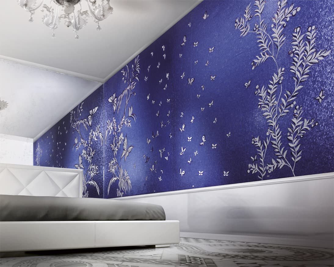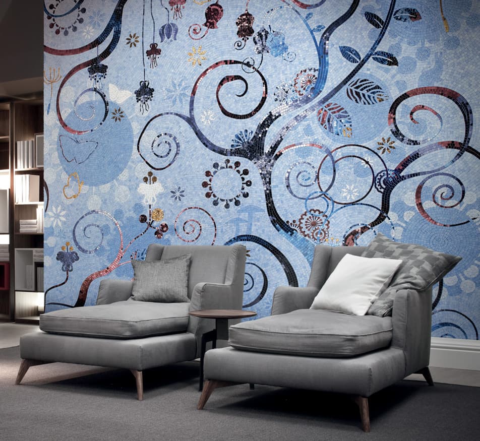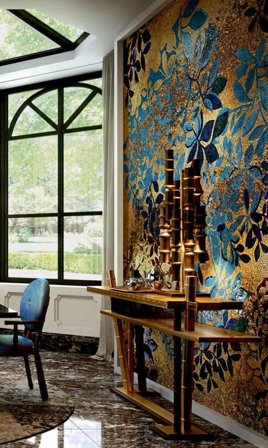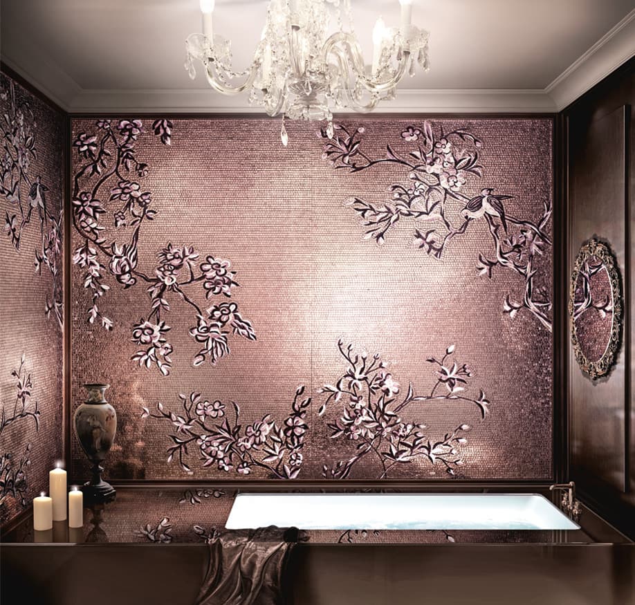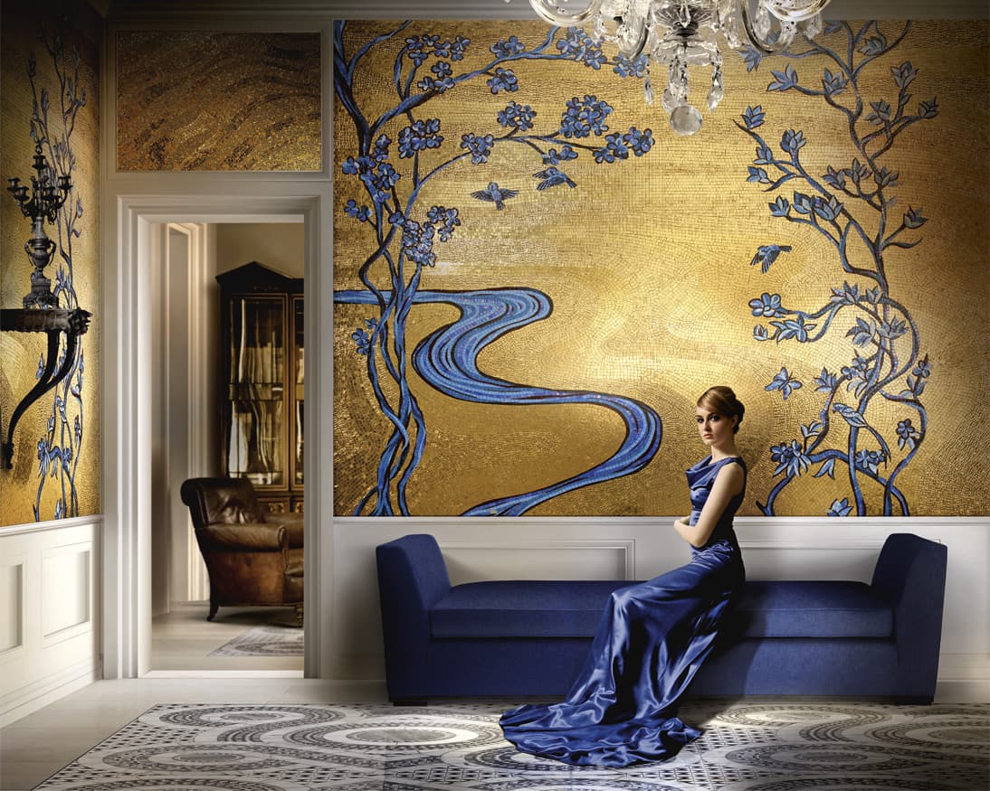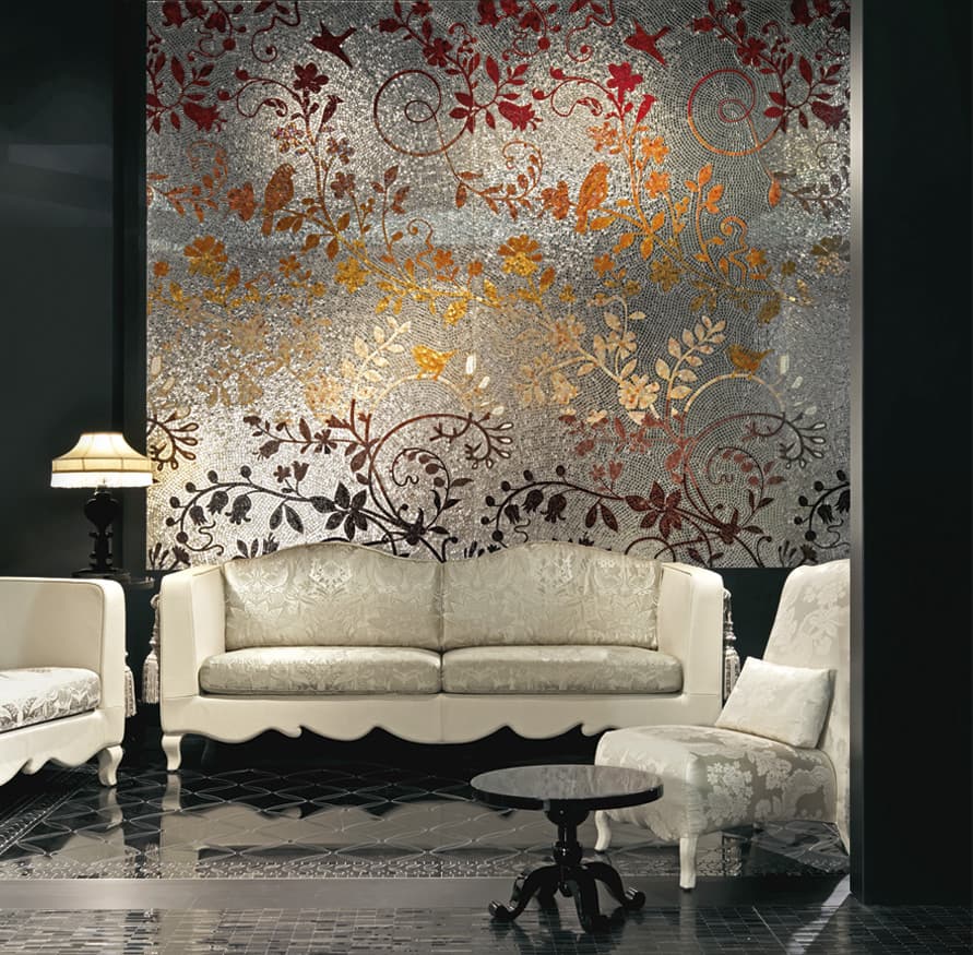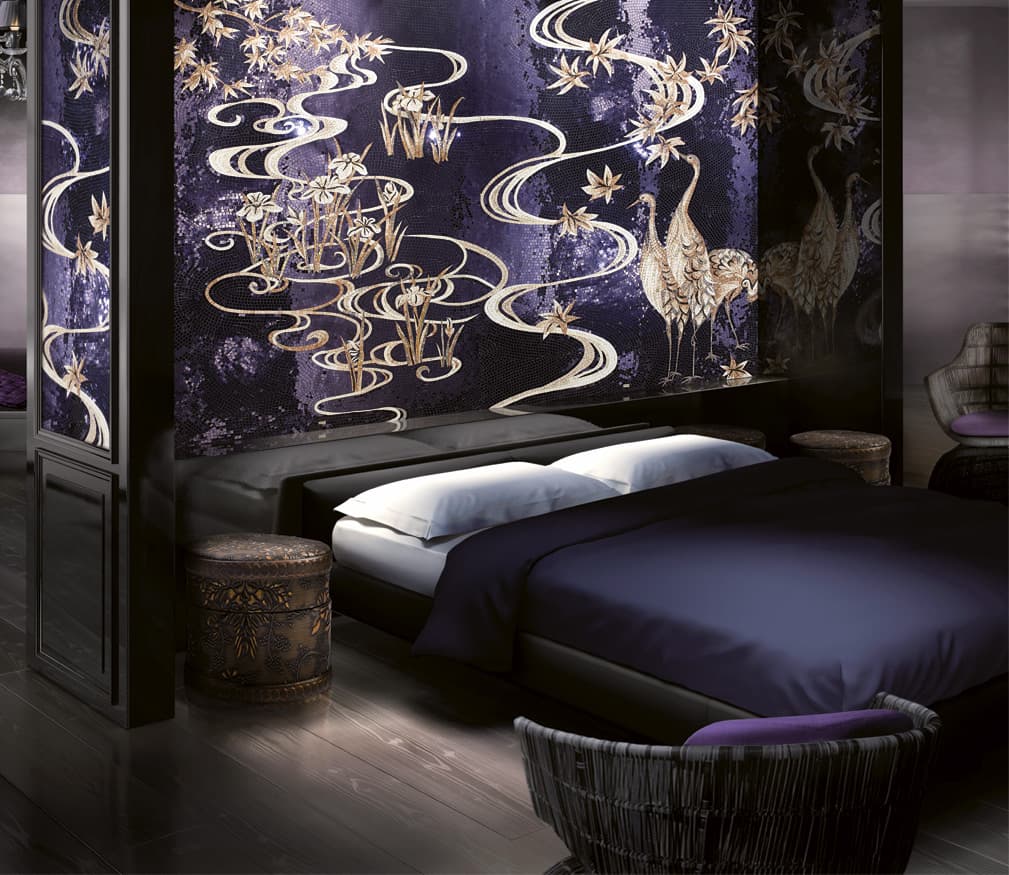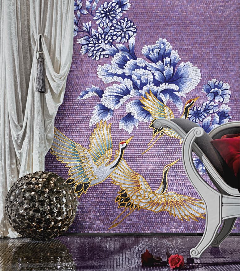 Forme e motivi che si ispirano all’Estremo Oriente. Sono capolavori espressi attraverso l’arte del mosaico artistico, qui elaborata secondo metodi ancor più raffinati. La preziosità degli sfondi esalta una natura avvolgente.