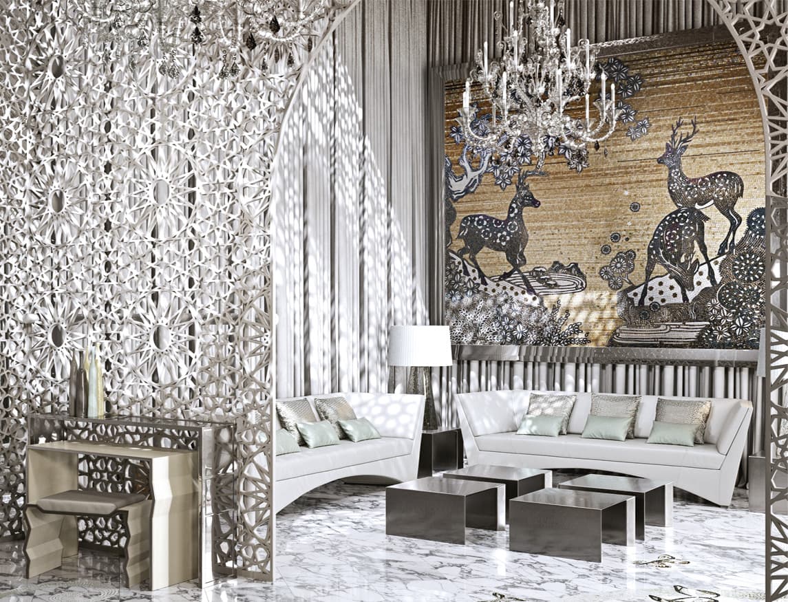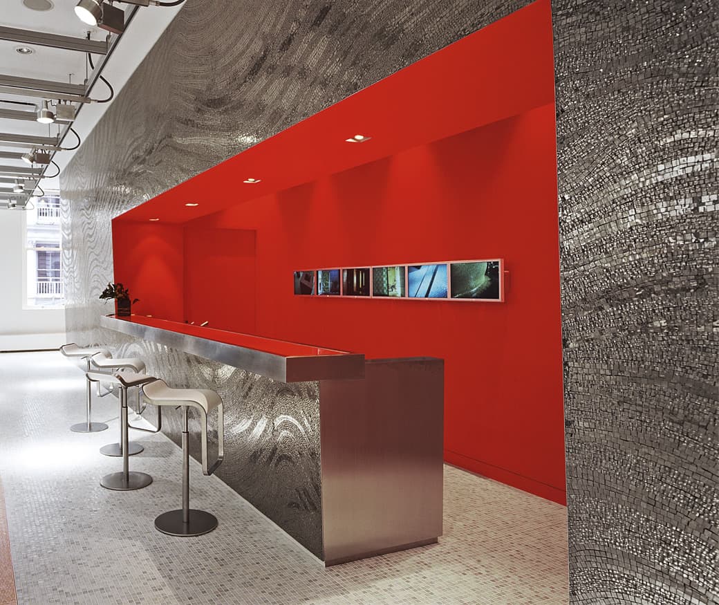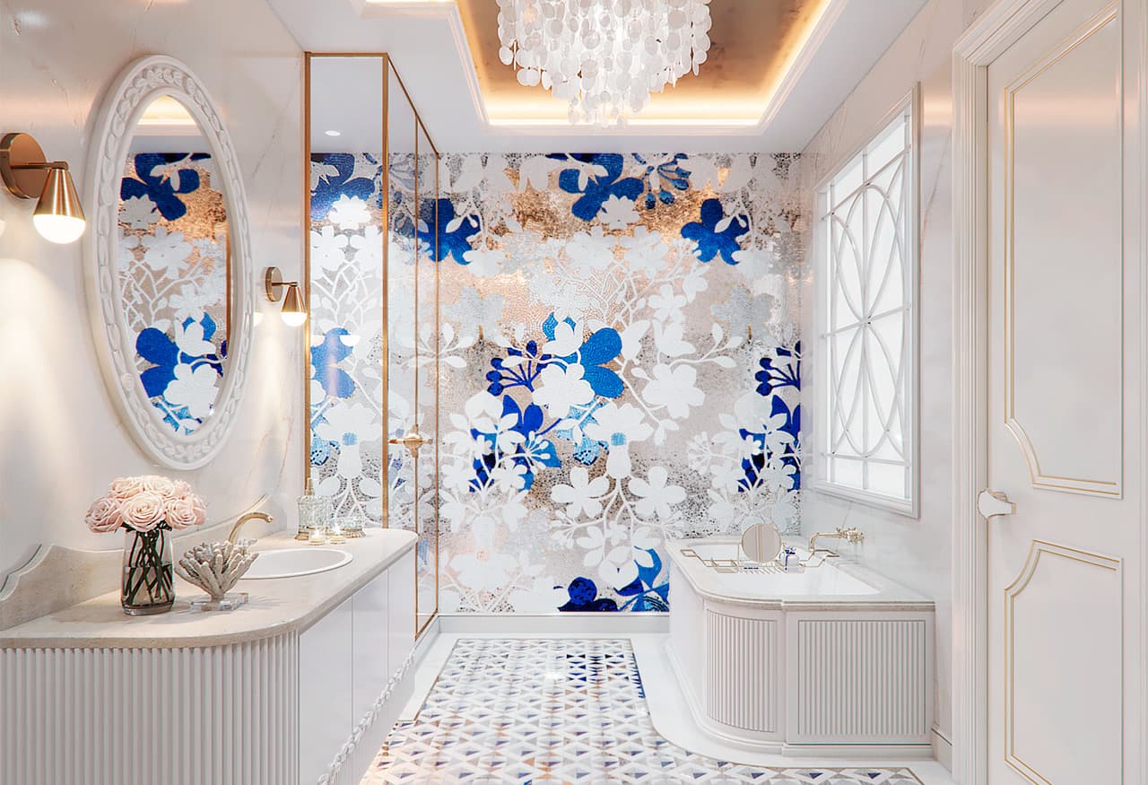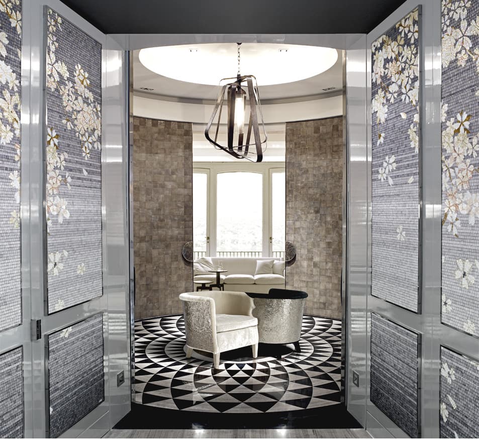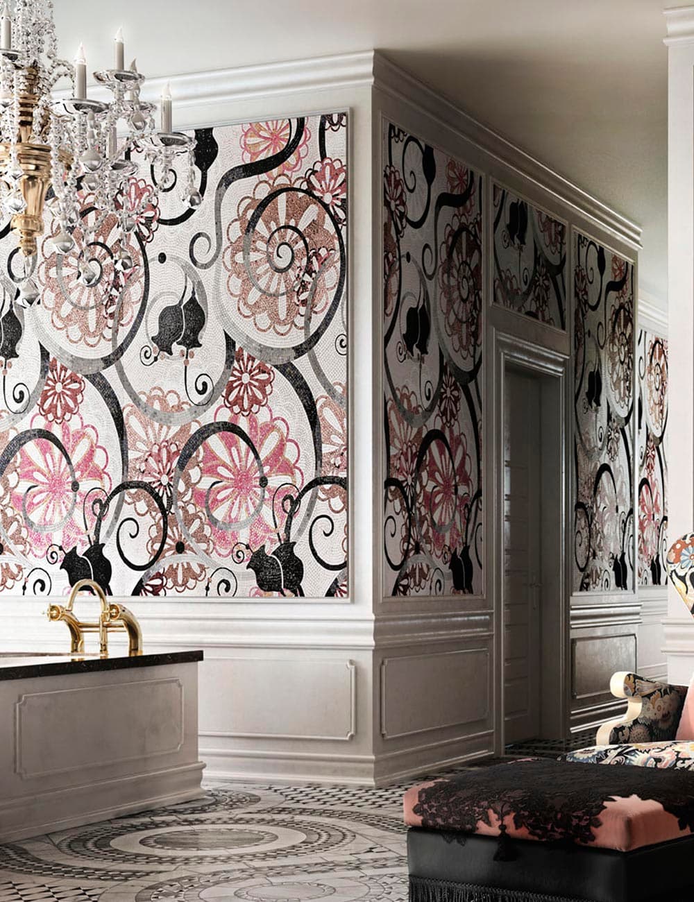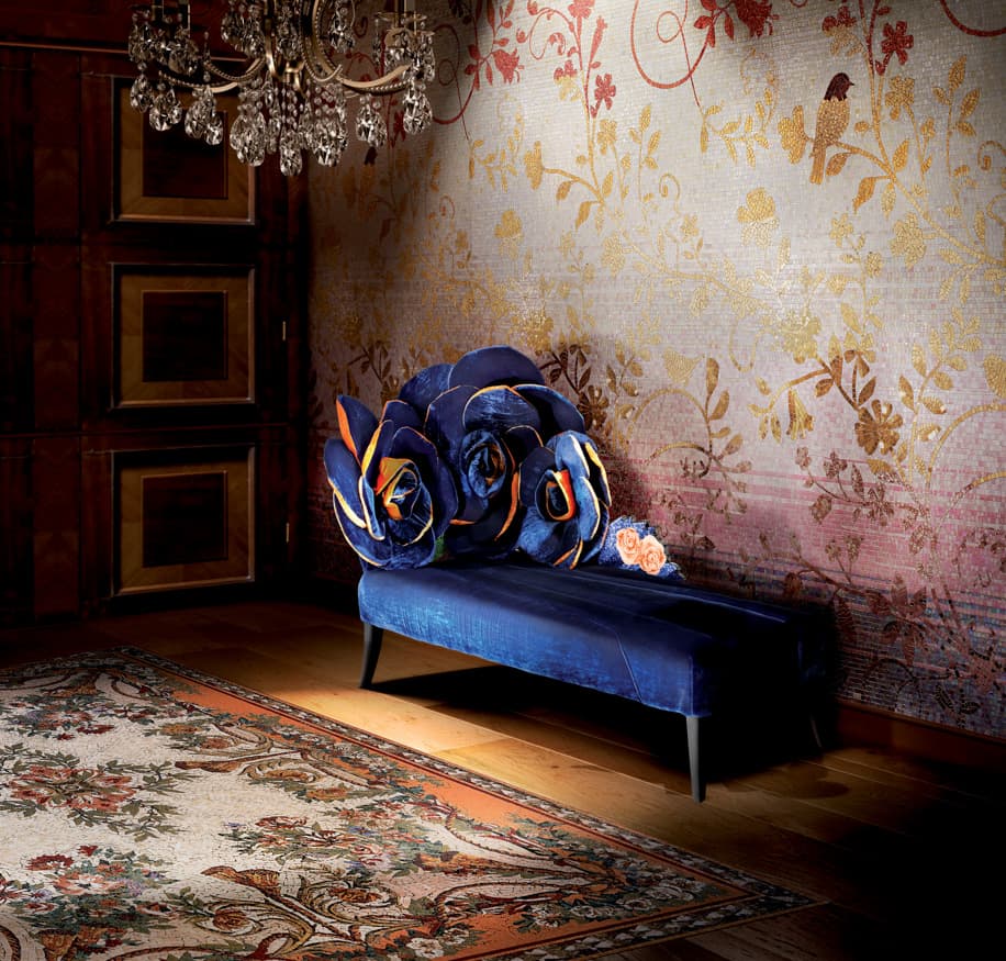 Forme e motivi che si ispirano all’Estremo Oriente. Sono capolavori espressi attraverso l’arte del mosaico artistico, qui elaborata secondo metodi ancor più raffinati. La preziosità degli sfondi esalta una natura avvolgente.