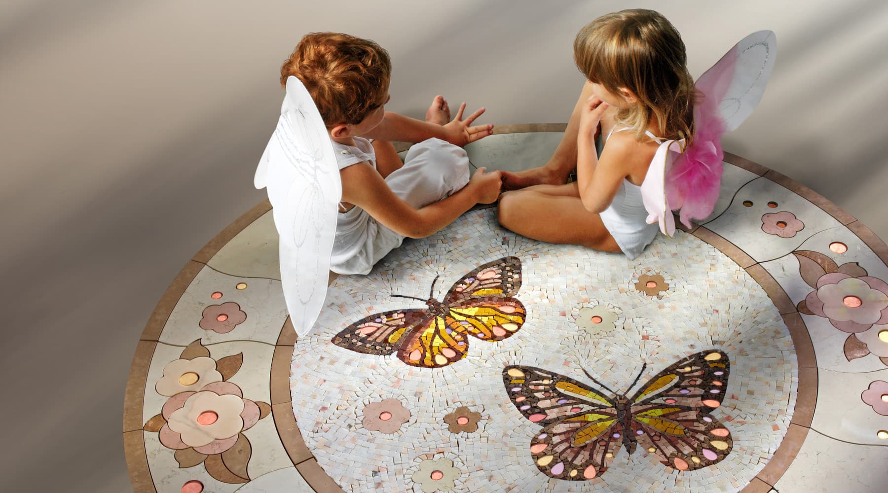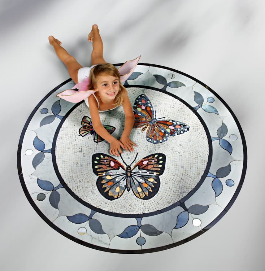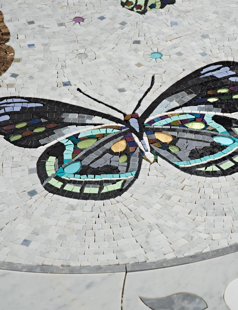 Superfici in marmo dove il mosaico artistico gioca un ruolo cruciale, creando farfalle dalle ali colorate capaci di dare luce e allegria. Materiali puri, quali il marmo e la pietra vengono così interpretati in una veste unica e accattivante.
