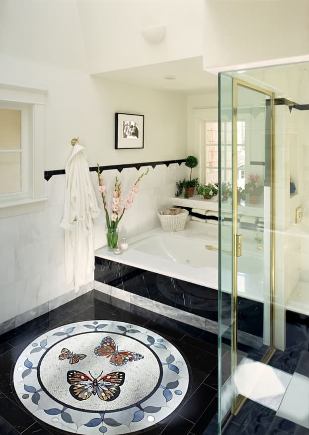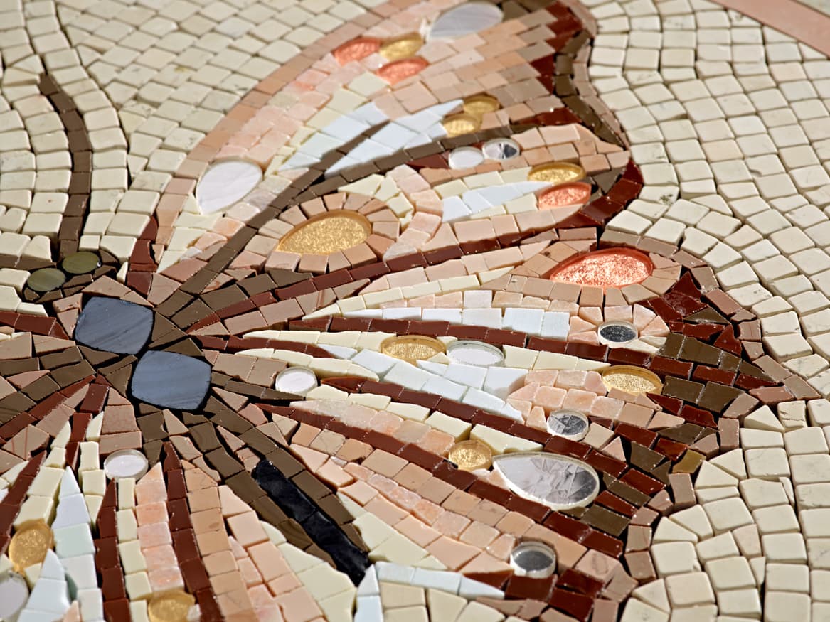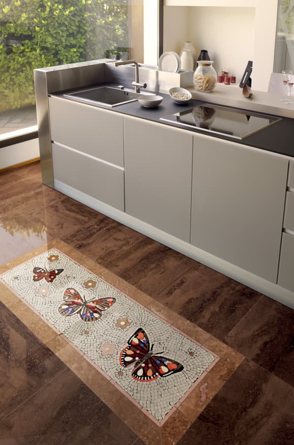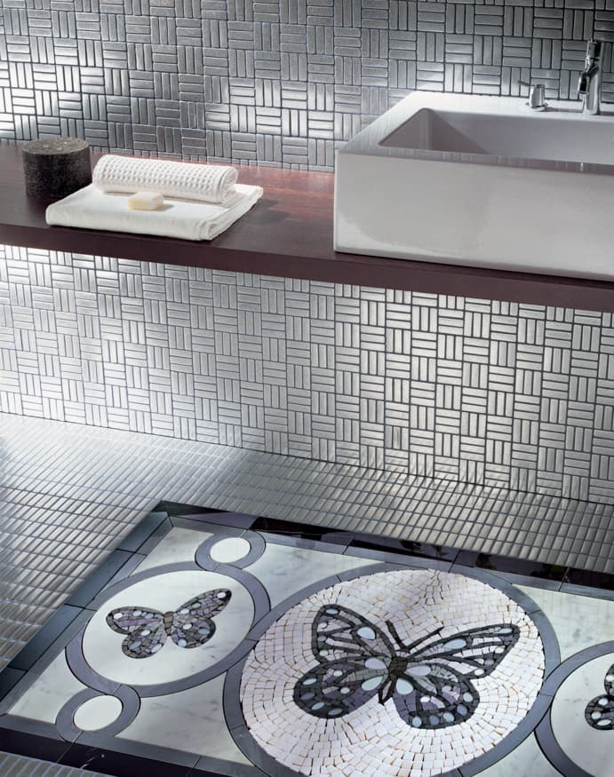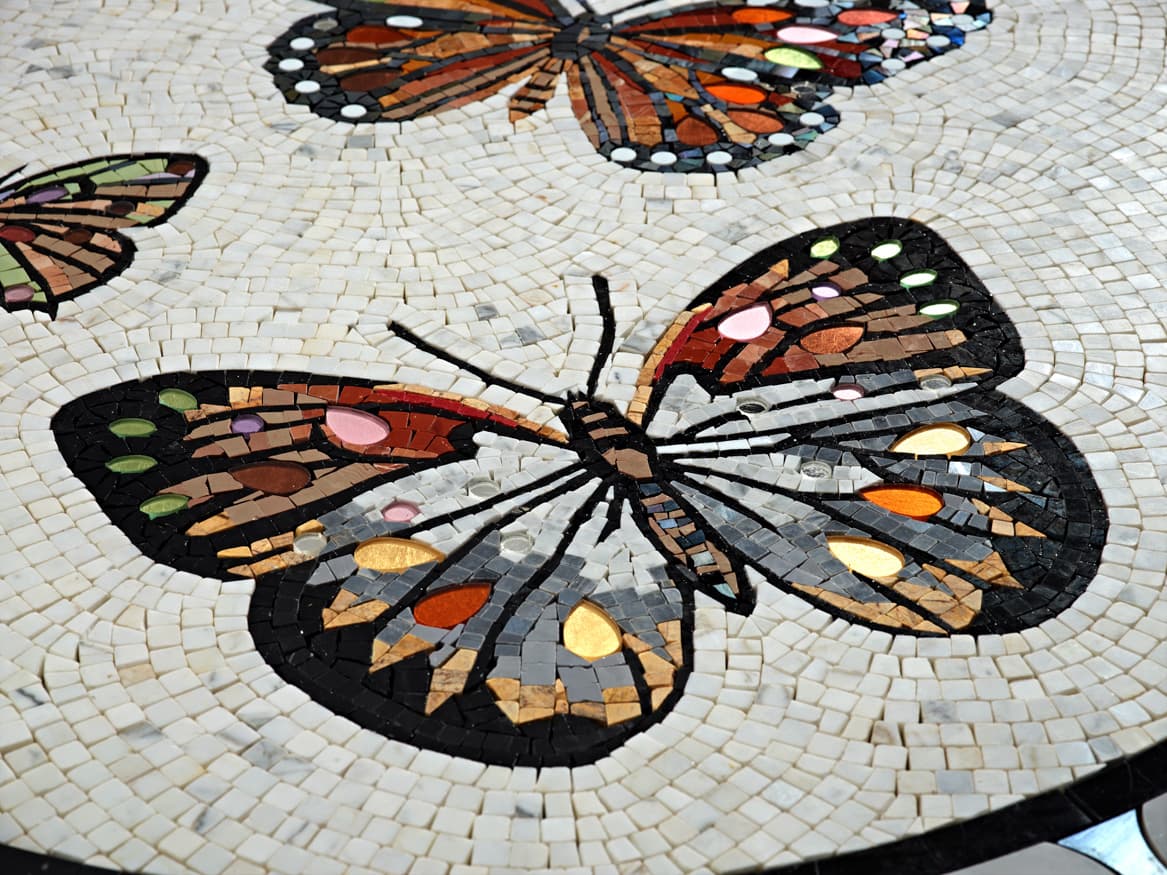 Superfici in marmo dove il mosaico artistico gioca un ruolo cruciale, creando farfalle dalle ali colorate capaci di dare luce e allegria. Materiali puri, quali il marmo e la pietra vengono così interpretati in una veste unica e accattivante.