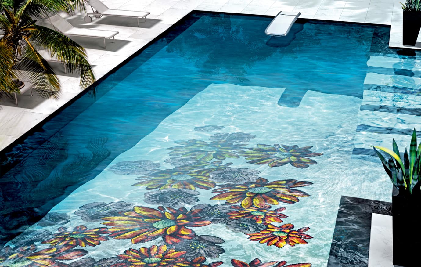 Per noi non è solo mosaico. È un modo per esprimere il tuo stile, la tua personalità. Per questo mettiamo a tua disposizione un’incredibile varietà di colori in diverse finiture. E non solo tinte unite. La scelta per rivestire la tua piscina in mosaico si amplia a decori artistici e mosaico pixel.
