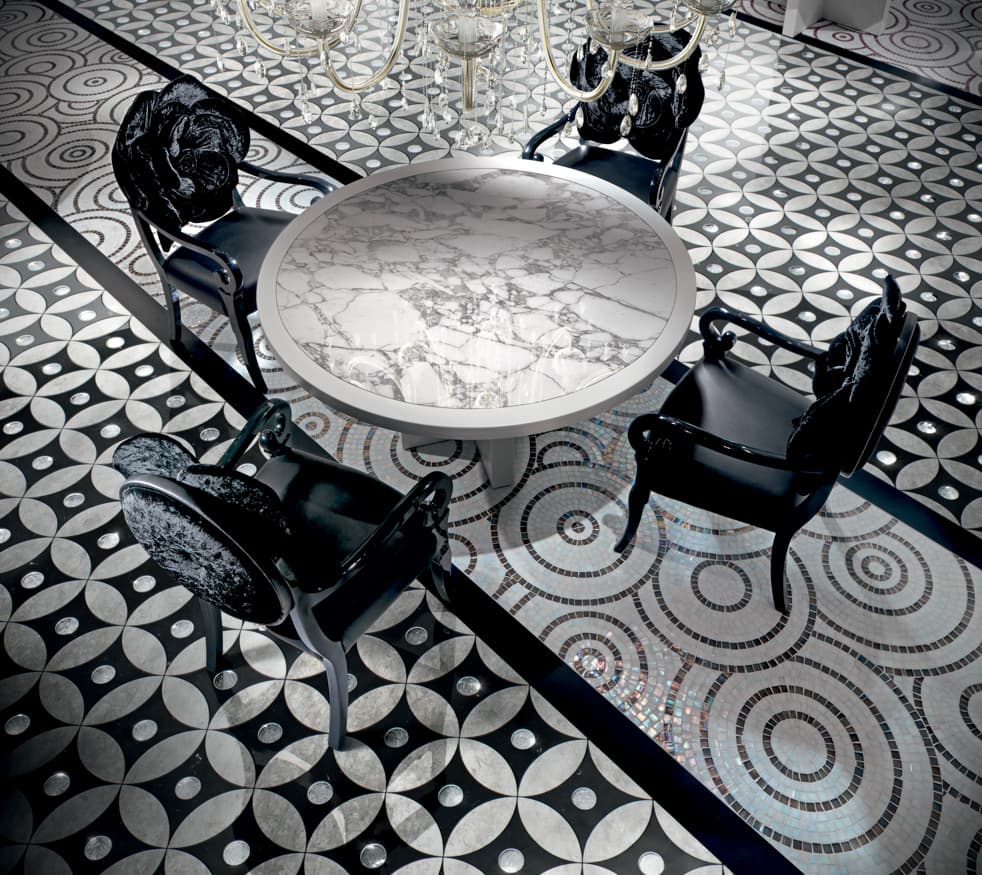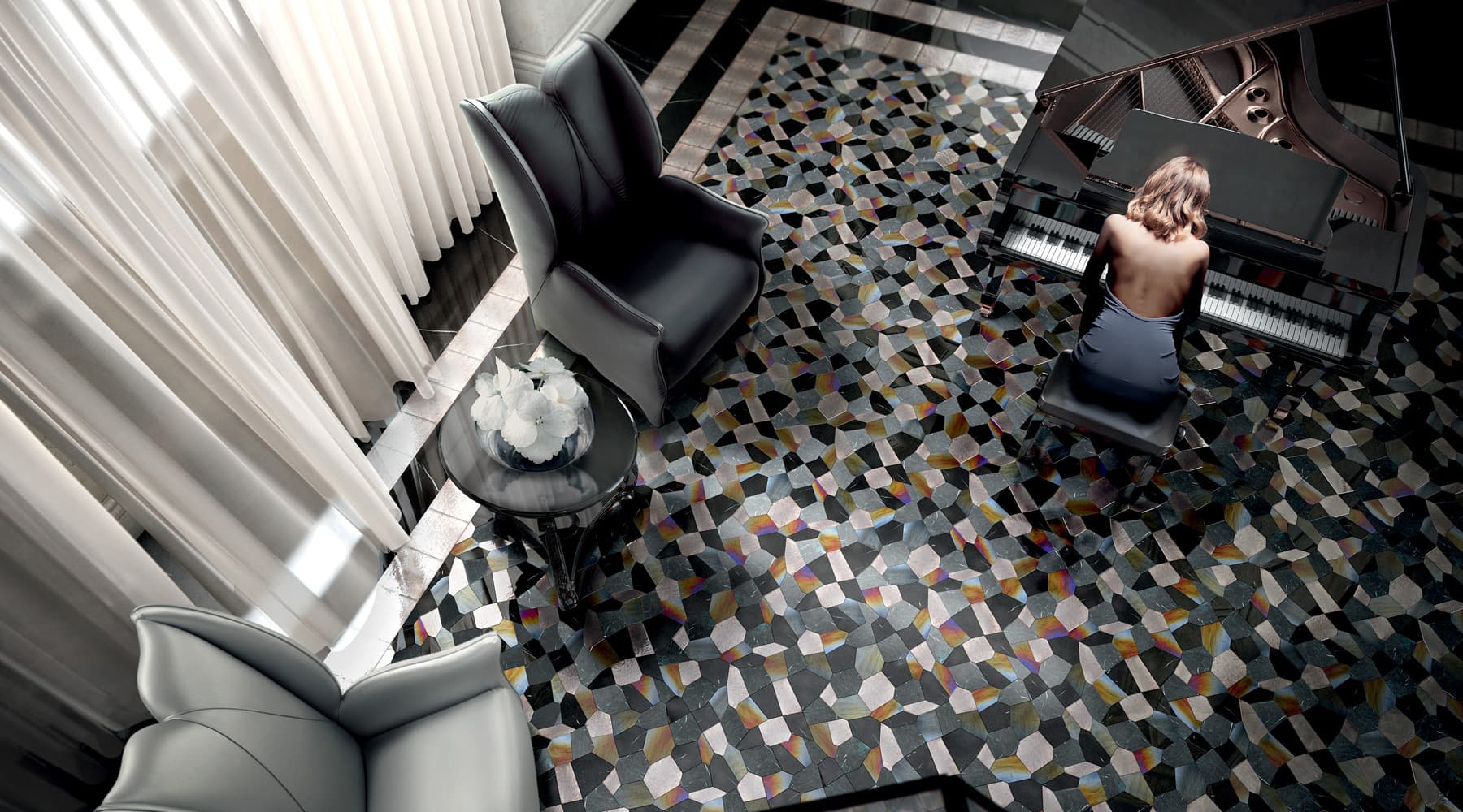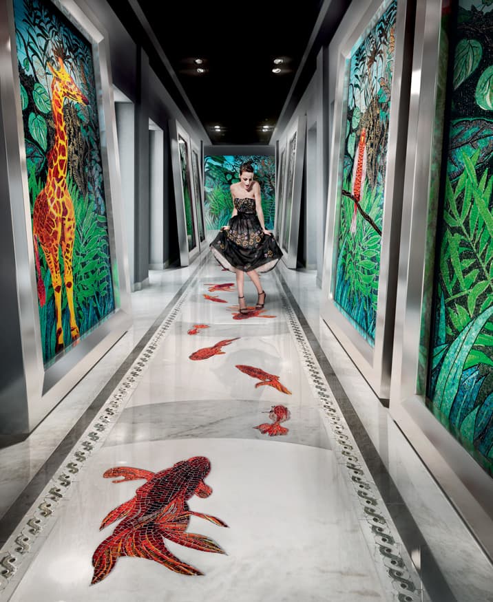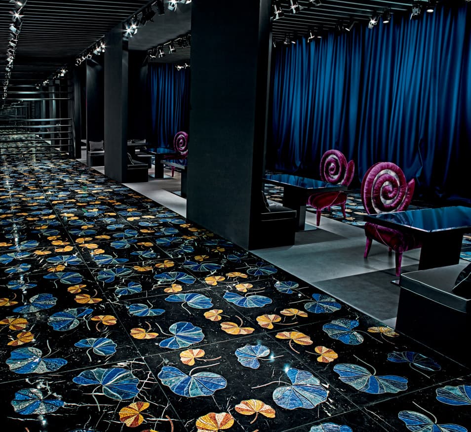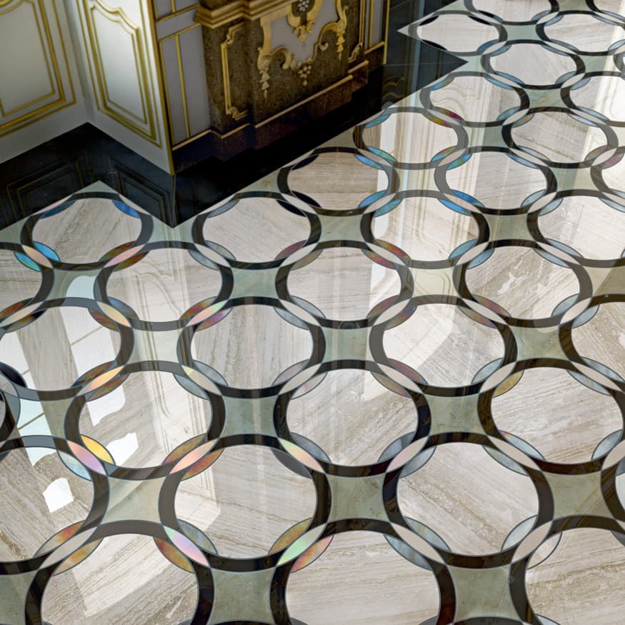 Marmi, pietre e vetro Murano le principali componenti di questi pavimenti da sogno. Linee curve e sinuose si intersecano tra loro, geometrie inedite, nuance equilibrate e tagli perfetti.