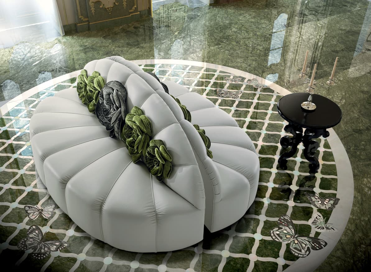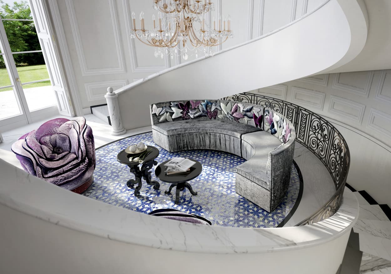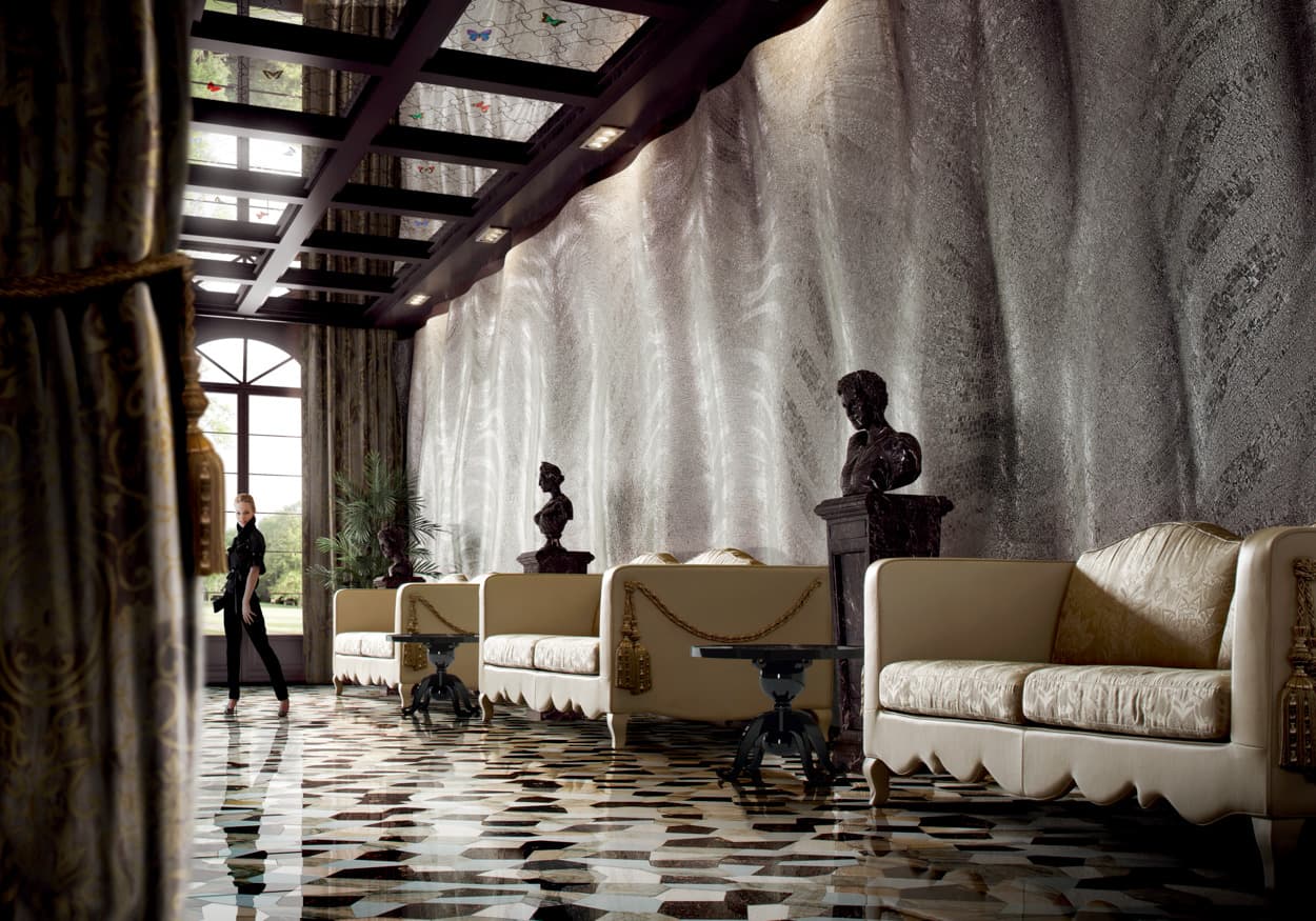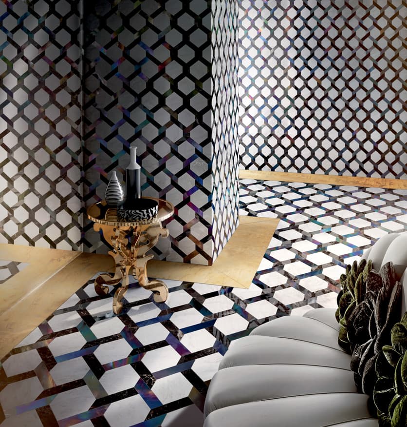 Marmi, pietre e vetro Murano le principali componenti di questi pavimenti da sogno. Linee curve e sinuose si intersecano tra loro, geometrie inedite, nuance equilibrate e tagli perfetti.