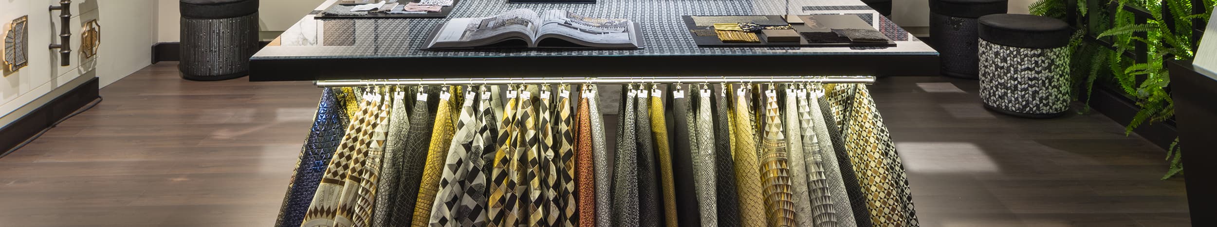 Tirelle e sciarpe, finiture a balza o a scalare. I campioni in tessuto, stoffa e altri materiali morbidi, proposti in diverse moduli e display per poter dare maggiore scelta di esposizione ed efficienza di utilizzo. Le cartelle per campioni, vanno incontro alle esigenze di presentazione più immediate, curando inoltre l’aspetto estetico. Il taglio e l'allineamento curato di tutti i campioni, danno un effetto finale d'impatto.